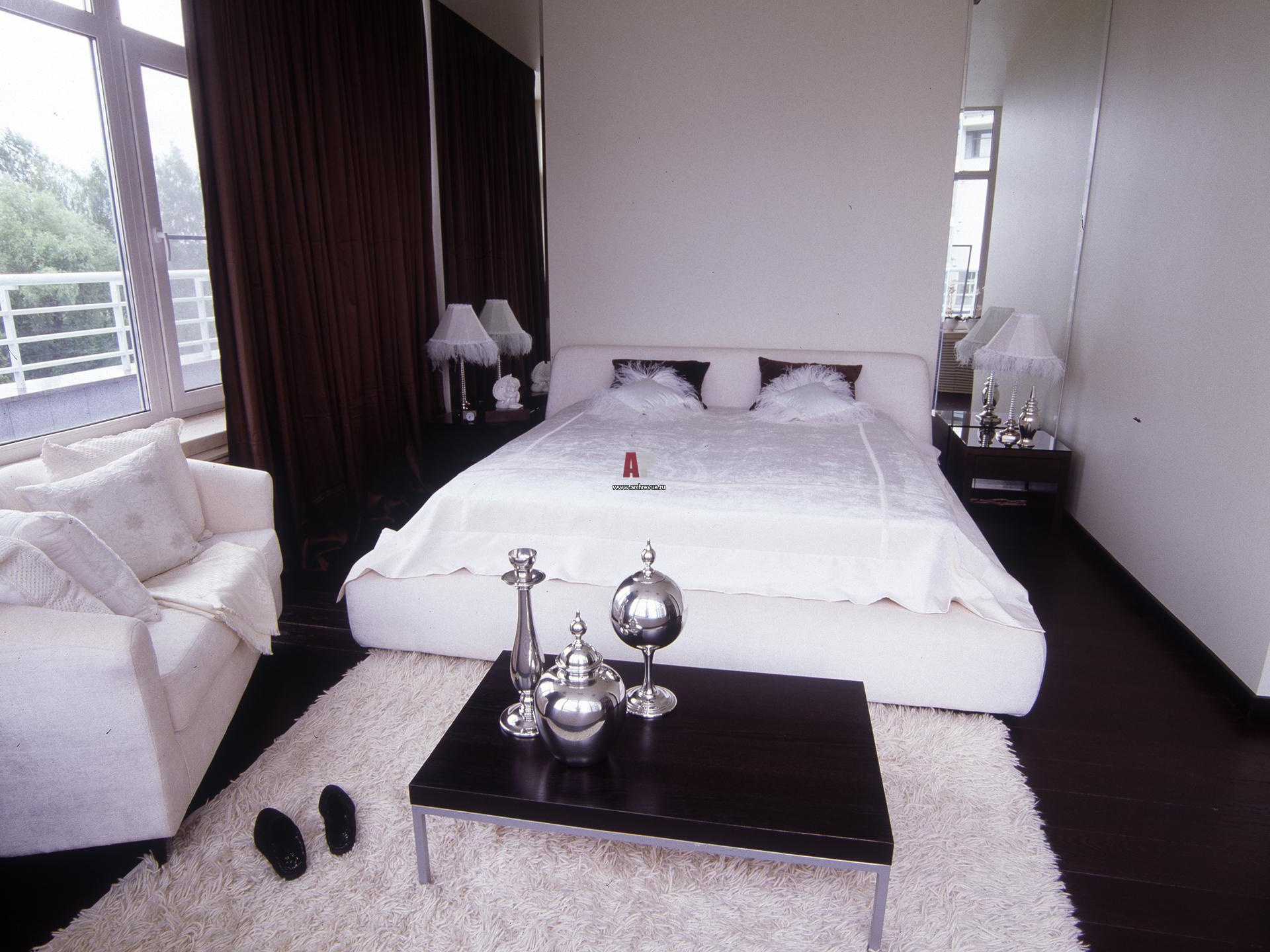 По контрасту с яркой гостиной спальня получилась спокойной, с одноуровневыми потолками, простыми покрасками и панорамными окнами с выходом на террасу.