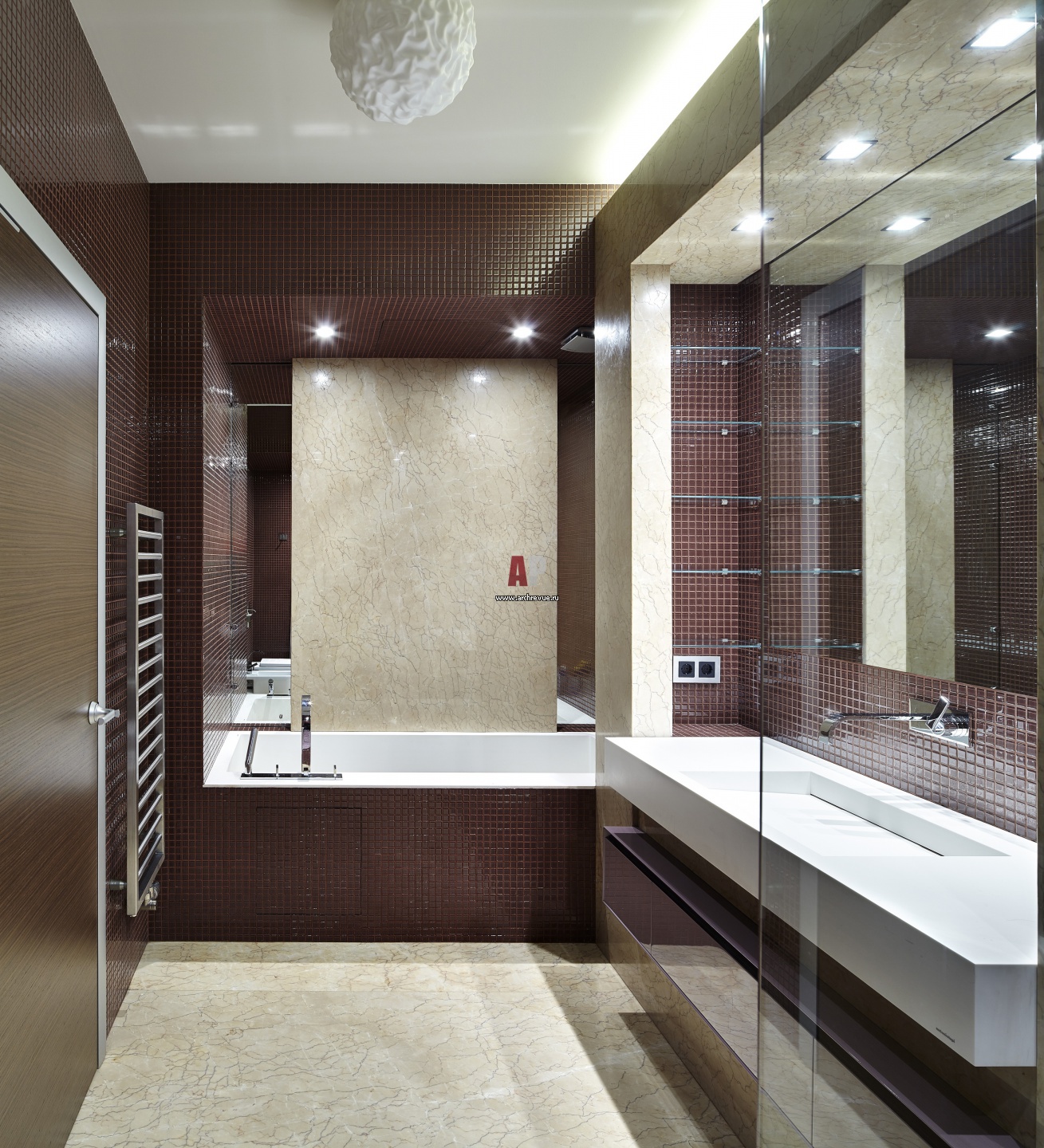 Фото интерьера современного санузла в шоколадной гамме. Плитка, мозаика, поставщик BARS RED.