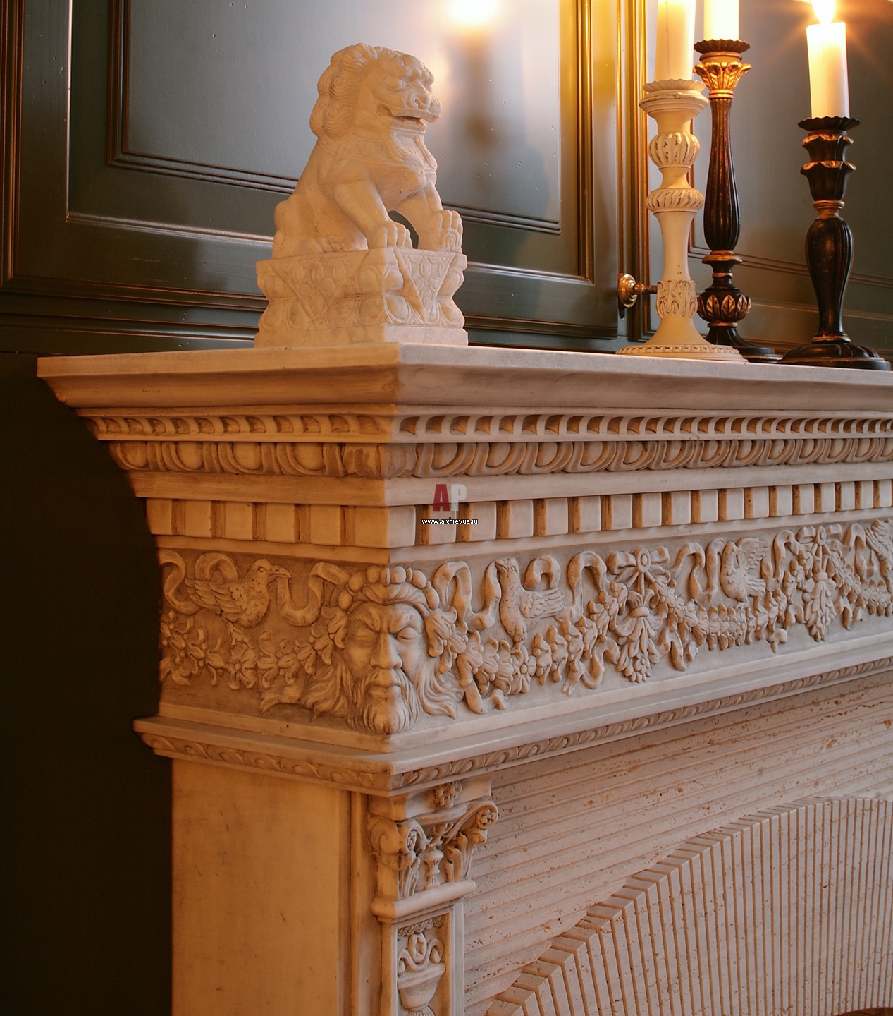 Камин с резным мраморным порталом, имитирующим старинный, выполнен по эскизу архитекторов мастерами из Санкт-Петербурга.
