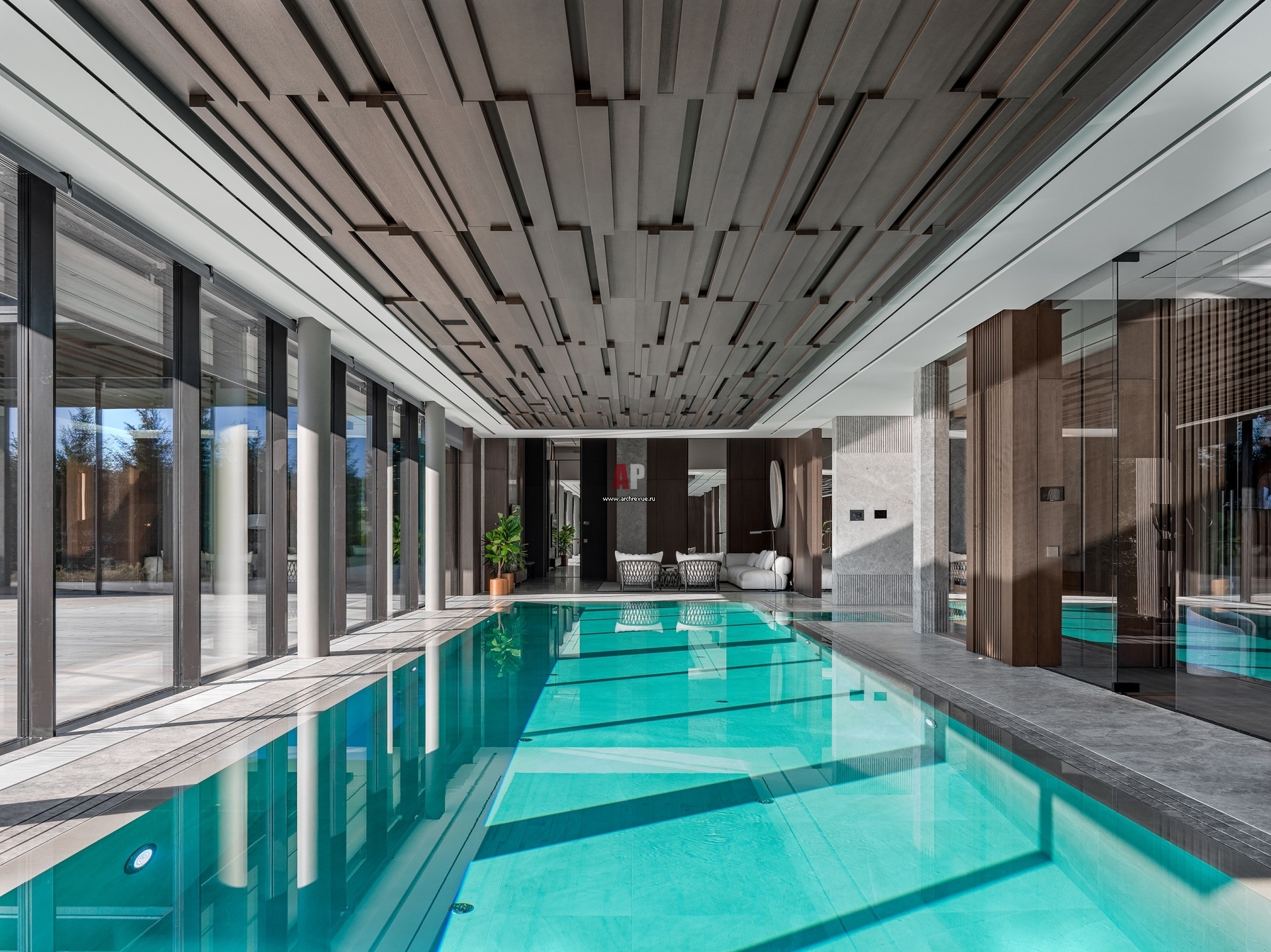 Бассейн расположен на первом этаже и имеет остеклен окнами в пол. Потолок оформлен деревянными структурными панелями