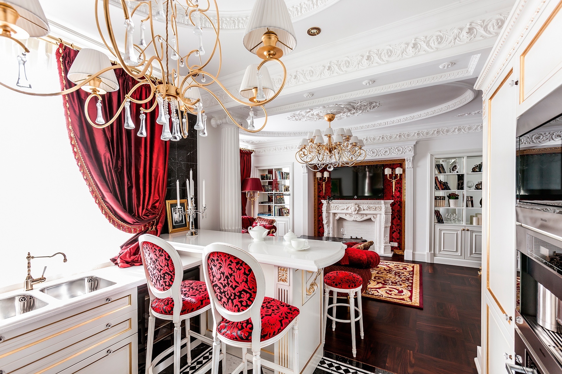 Интерьер эклектичной кваритры с элементами классики, необарокко и современного стиля. Белоснежная кухня, Martini Mobili.