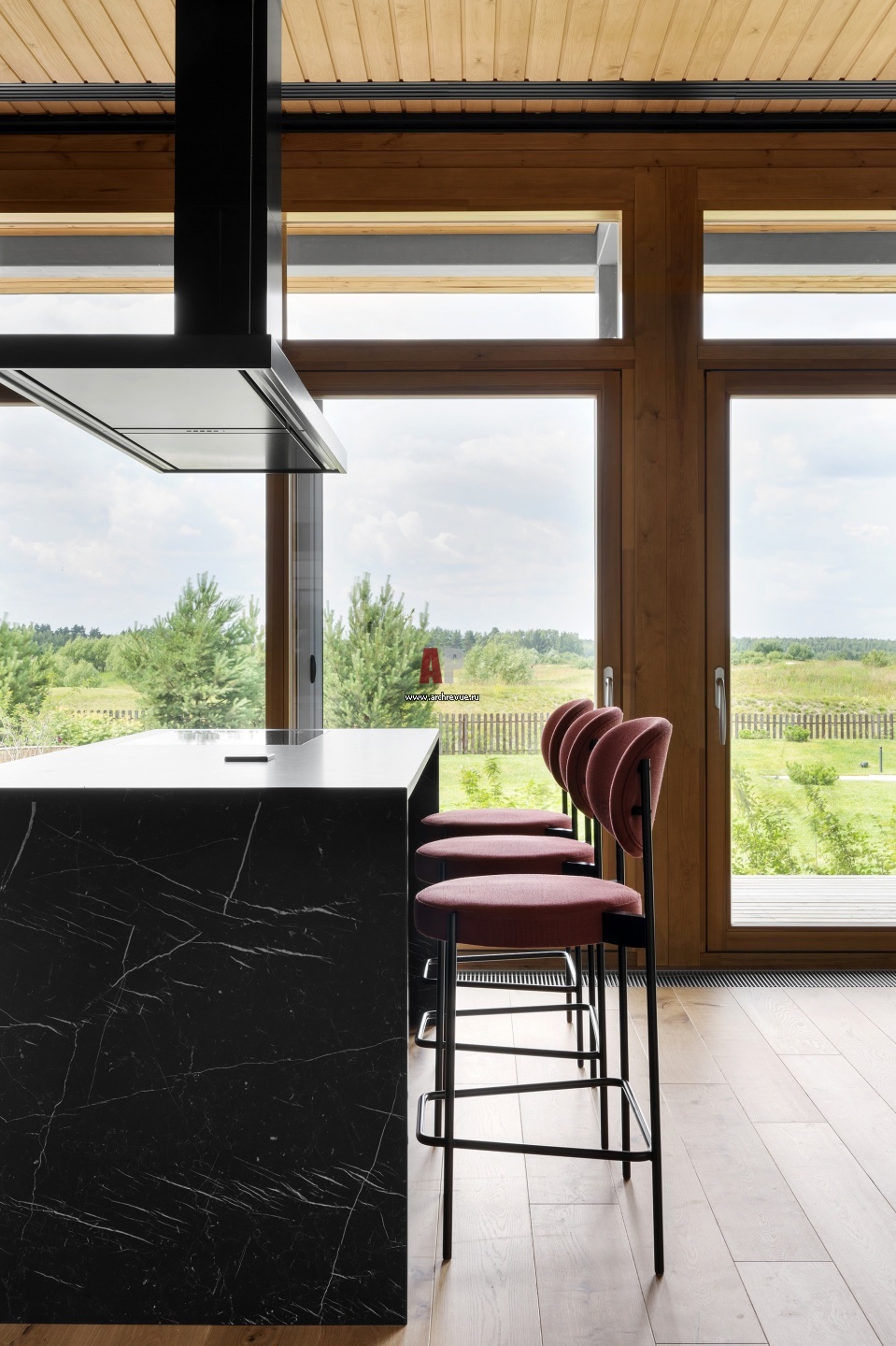 Деревянный дом в заповедной зоне Подмосковья для трех поколений семьи. Интерьер кухни с островом.