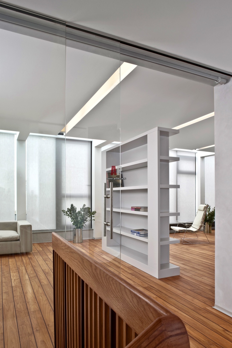 Кабинет на втором этаже в минимализме. Перегородка из прозрачного стекла. По задумке архитектора пол на двух этажах из цельной палубной доски, чтобы перегородки не «ломали» его поверхность были использованы раздвижные конструкции на верхних направляющих, которые не касаются пола.