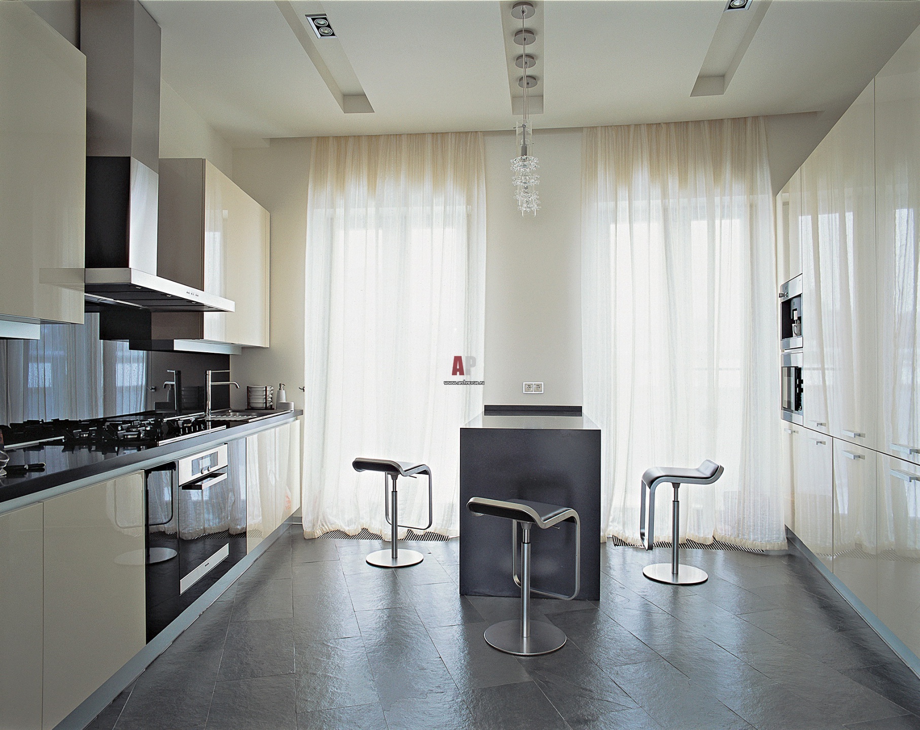 Кухня в стиле минимализм отделена от гостиной стеклянными раздвижными дверями. Светло-бежевые лакированные поверхности кухонной мебели выигрышно смотрятся на фоне пола из серого сланца.