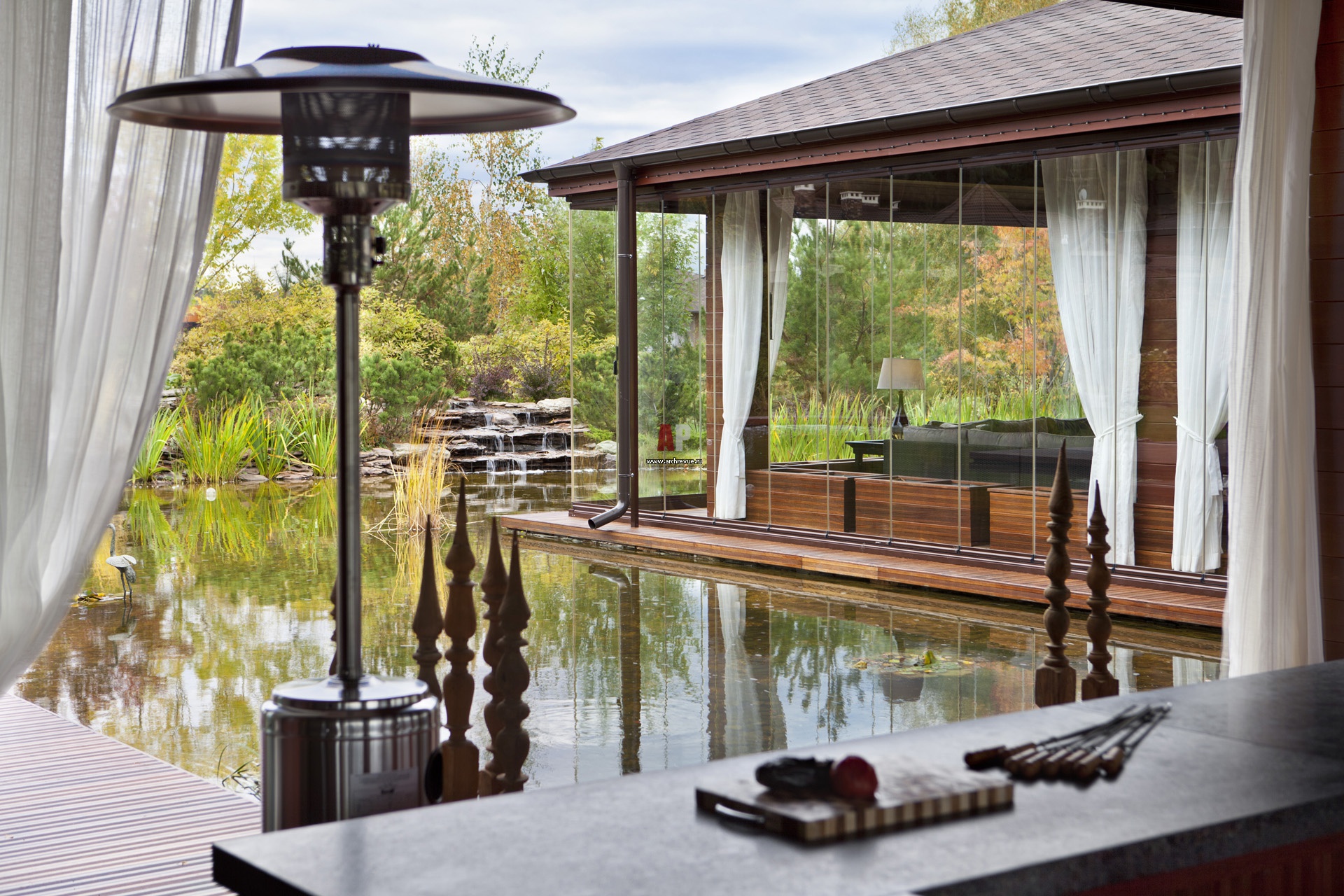 К основному объему присоединена крытая терраса (площадью около 400 кв. м) с панорамными окнами. Под ними – плещется вода водоема.