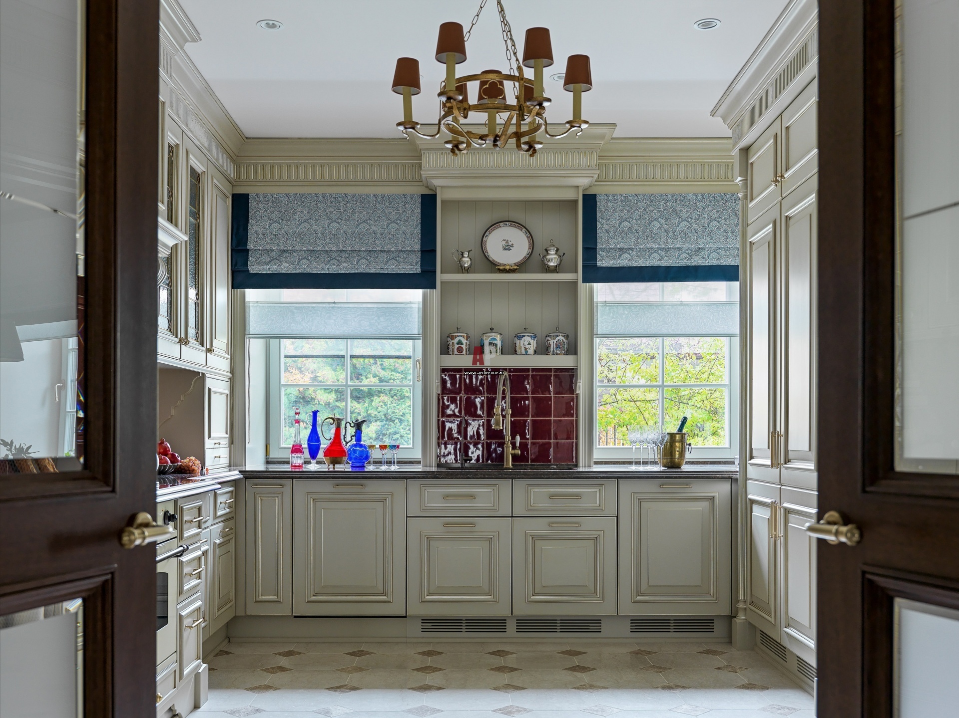 Кухня сделана проходной, в нее ведут два входа: из парадного холла и из столовой. Кухонный гарнитур, Albero Arte. На полу – мраморная плитка.