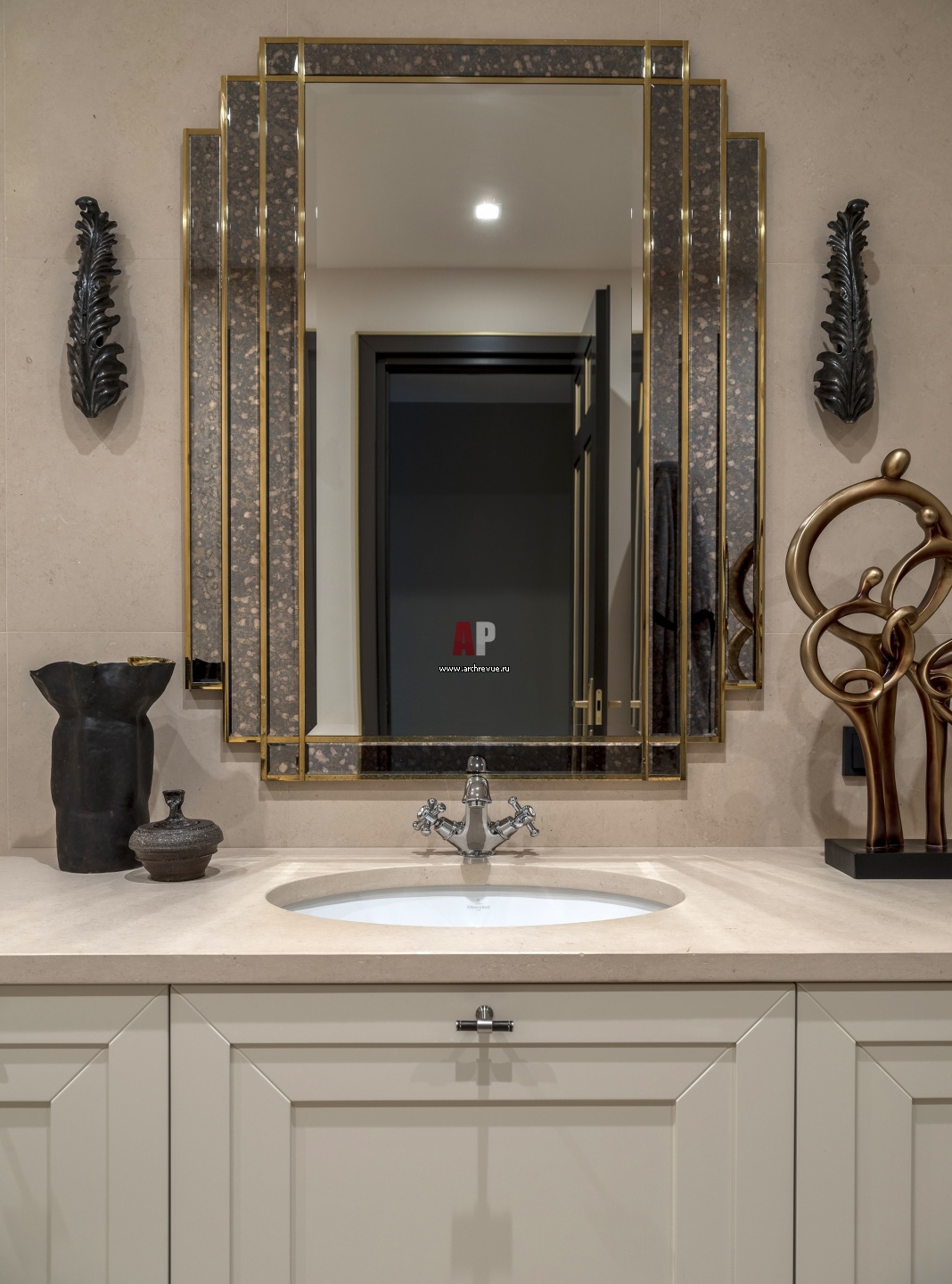 Интерьер ванной комнаты в мужской представительской квартире. По обе стороны от зеркала – кованые бра в виде листьев аканта. Они изготовлены на заказ, по эскизам авторов проекта, компания «Изокъ». Раковина, Villeroy & Boch.