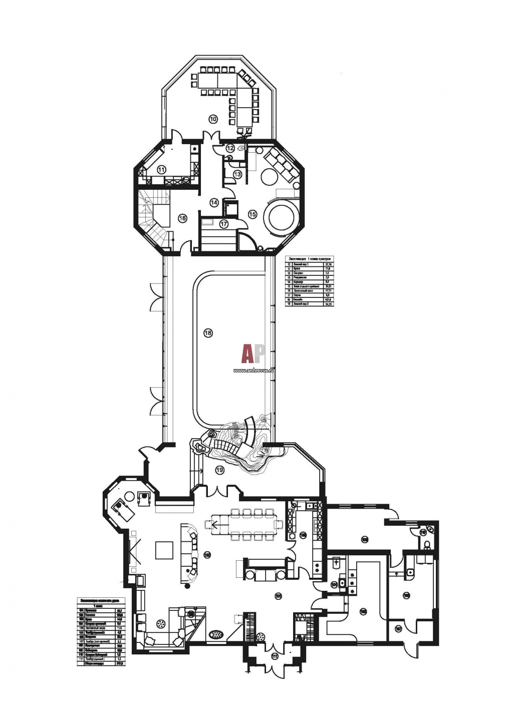 Планировка семейной резиденции с бассейном и зимним садом. План второго этажа основного дома и пристройки.