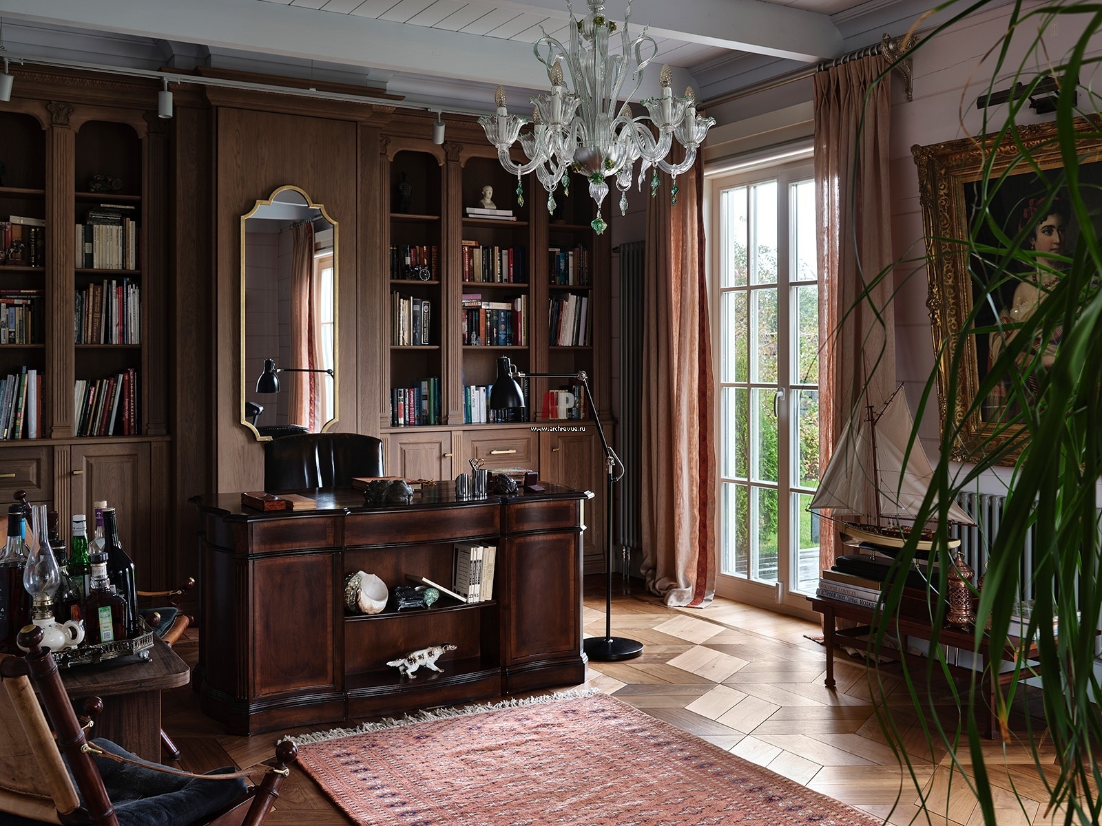 Кабинет. Письменный стол, Theodore Aleхander. Люстра, De Majo. Алая тесьма с пайетками на шелковых шторах, Samuel & Sons. Книжный шкаф изготовлен на заказ по эскизам.