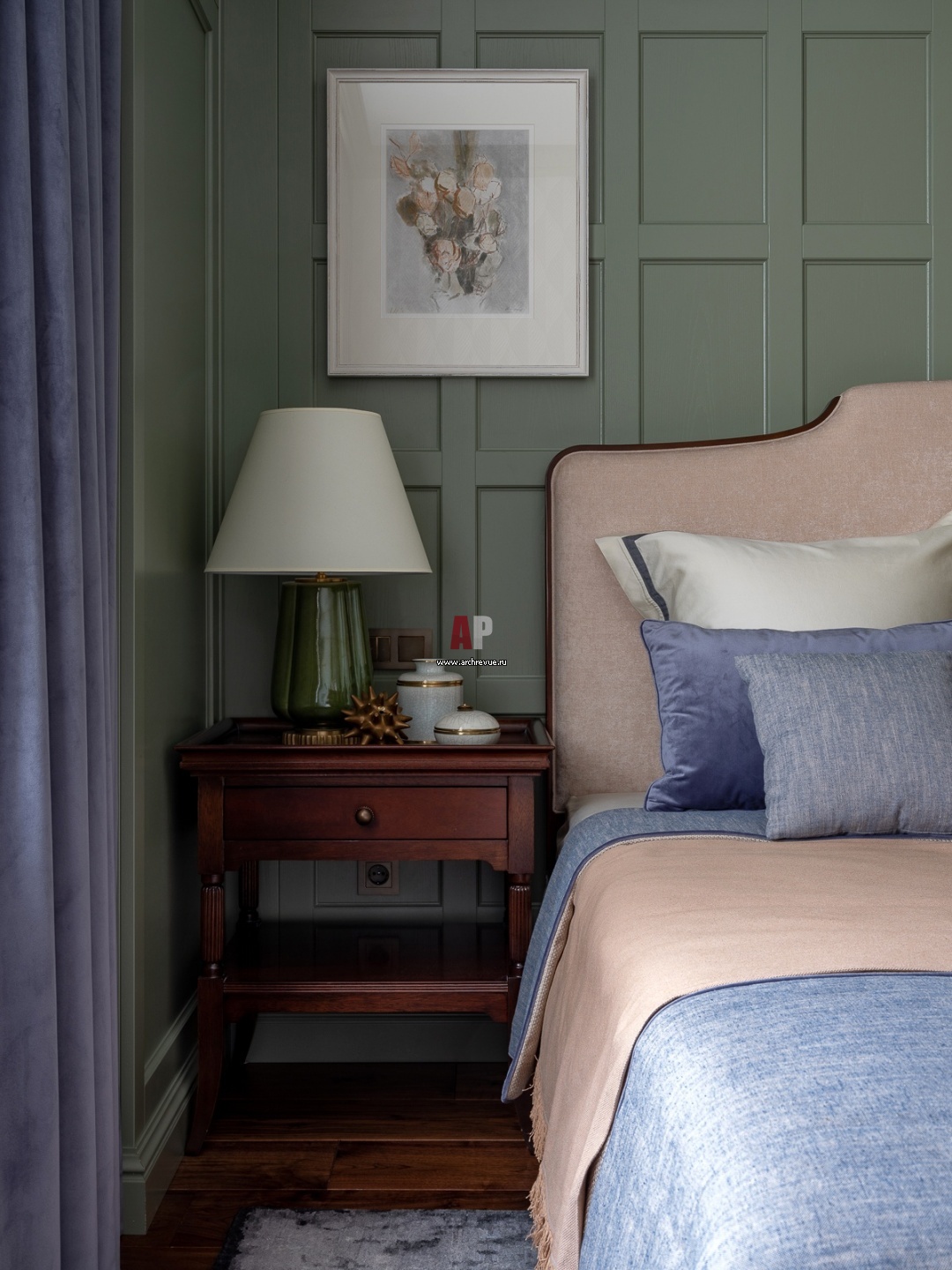 Двухэтажная квартира с атмосферой загородного дома. Интерьер спальни с деревянными панелями оливкового тона.