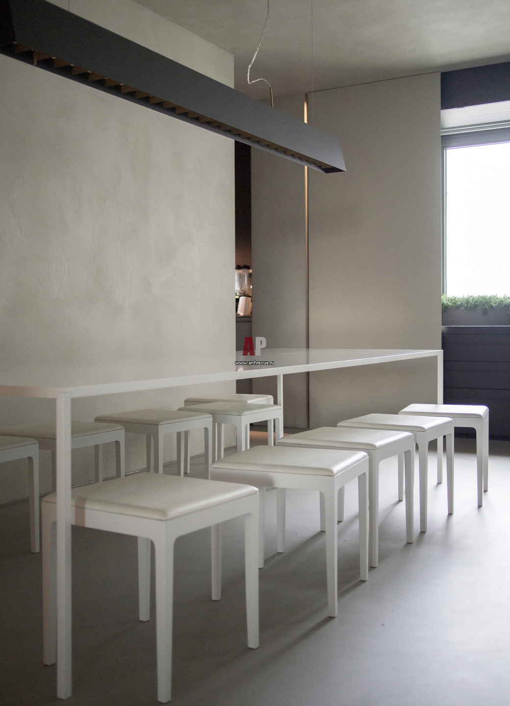 Белая столовая. Для оформления окон место текстильных штор использованы деревянные раздвижные ширмы, которые позволяют создавать различные сценарии освещения в помещениях.
