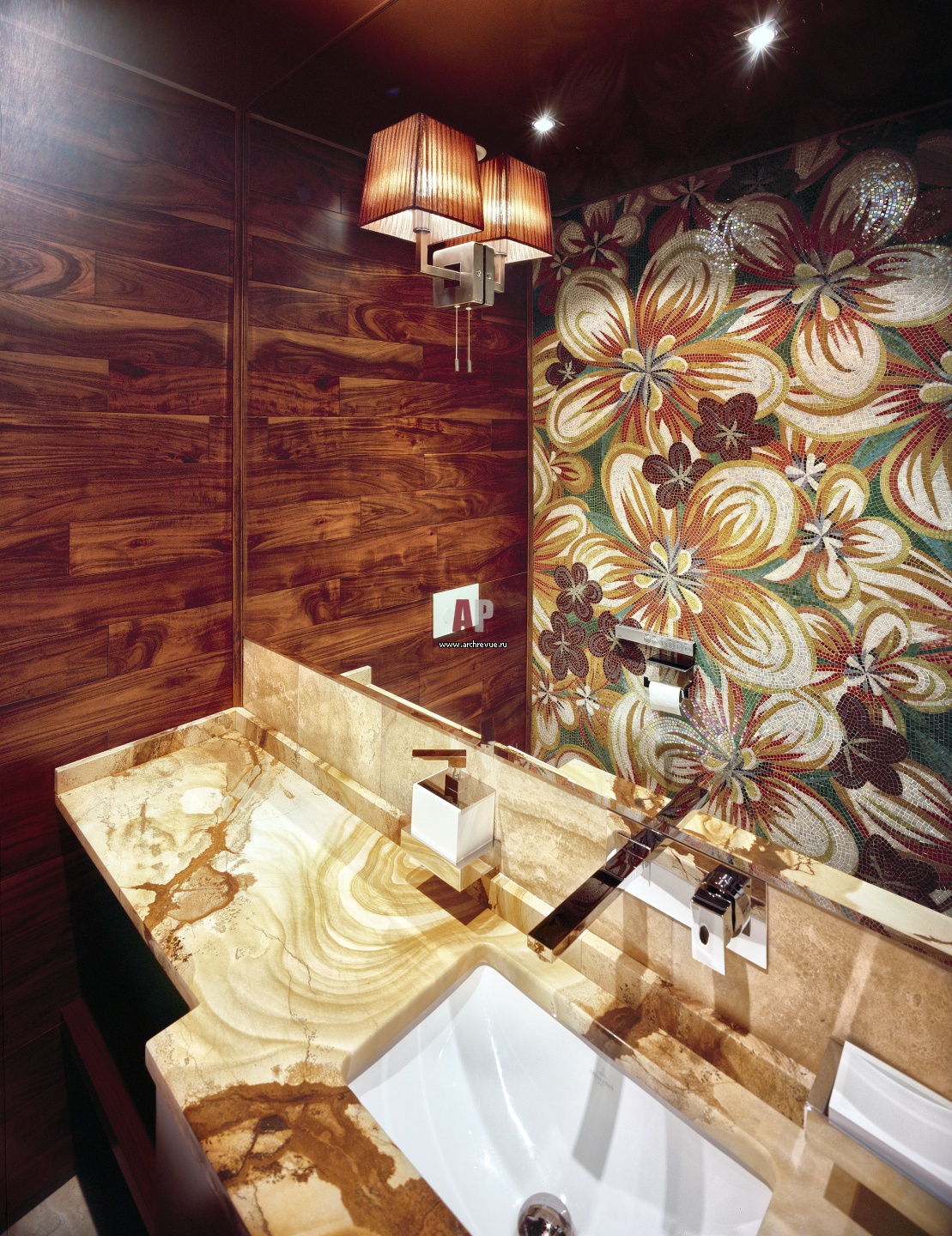 Фото интерьера гостевого санузла. Одна из стен оформлена мозаичным панно с цветами. Столешница раковины выполнена из оникса. Сантехника, Villeroy & Boch.