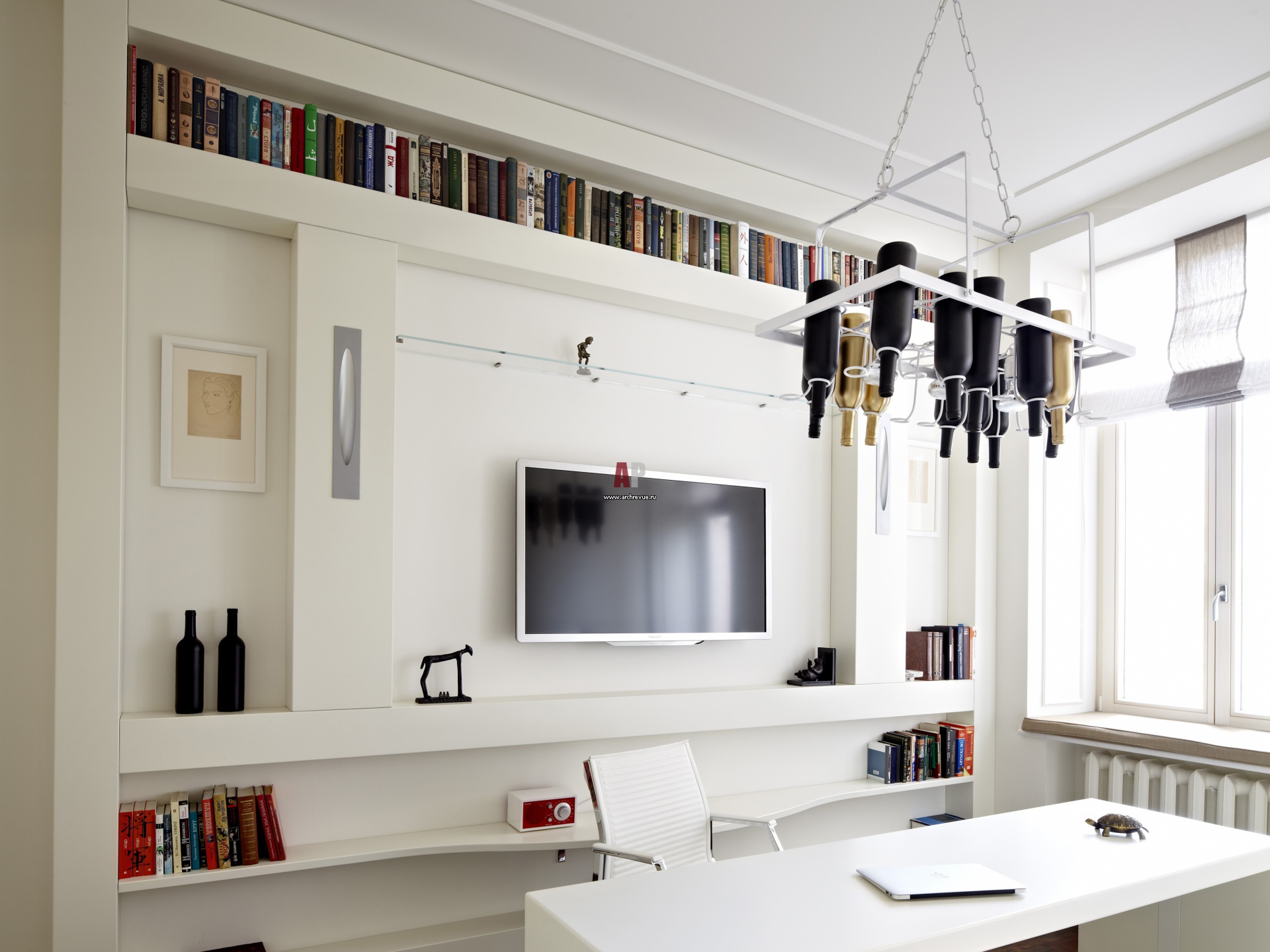 В белой спальне на подоконники положены подушки, на которых удобно сидеть. В небольшом жилом помещении они заменяют диваны. Белый стеллаж сделан на заказ по эскизам. Металлическая люстра из бутылок куплена в московском салоне и перекрашена в другие цвета: основание сделано белым, а бутылки черно-золотыми.