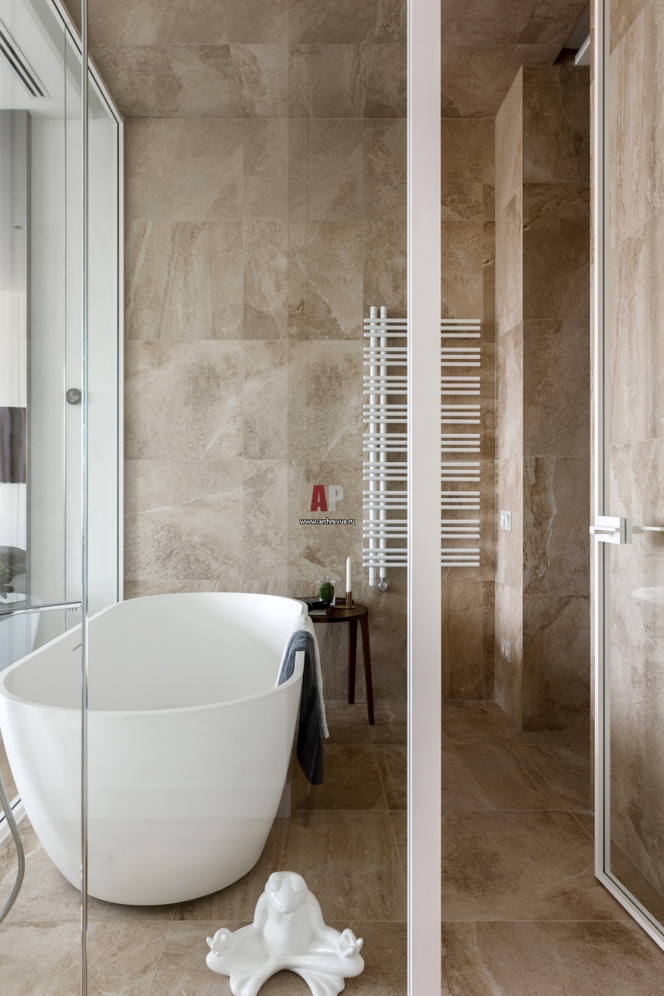 Интерьер ванной комнаты в панорамной квартире. Отдельно стоящая ванна – давняя мечта хозяина. Ванна, Riho. Напольный смеситель, Noken.
