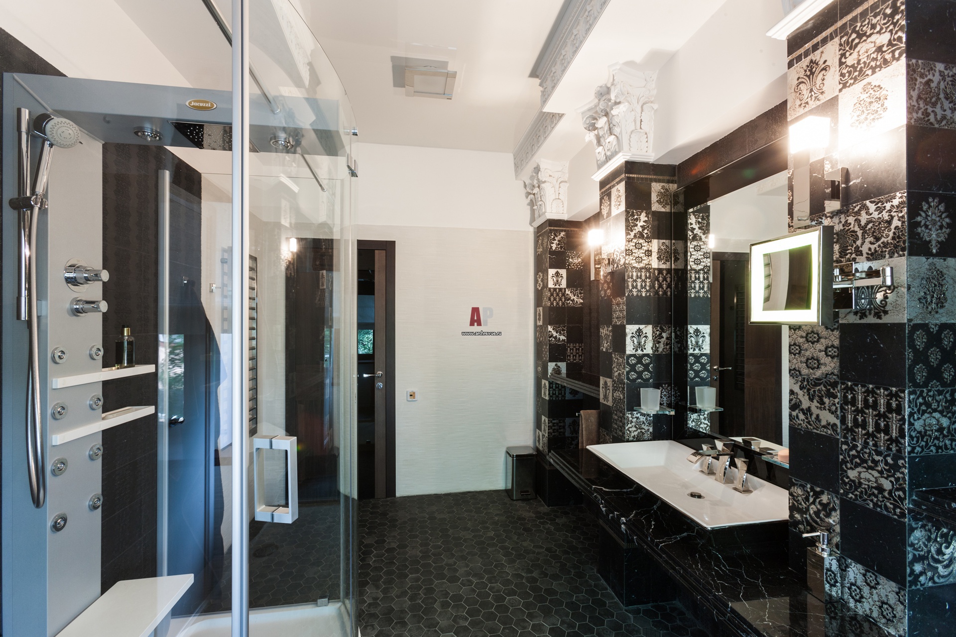 На фото – ванная комната в стиле неоклассика. Душевая кабина с гидромассажем, Jacuzzi.