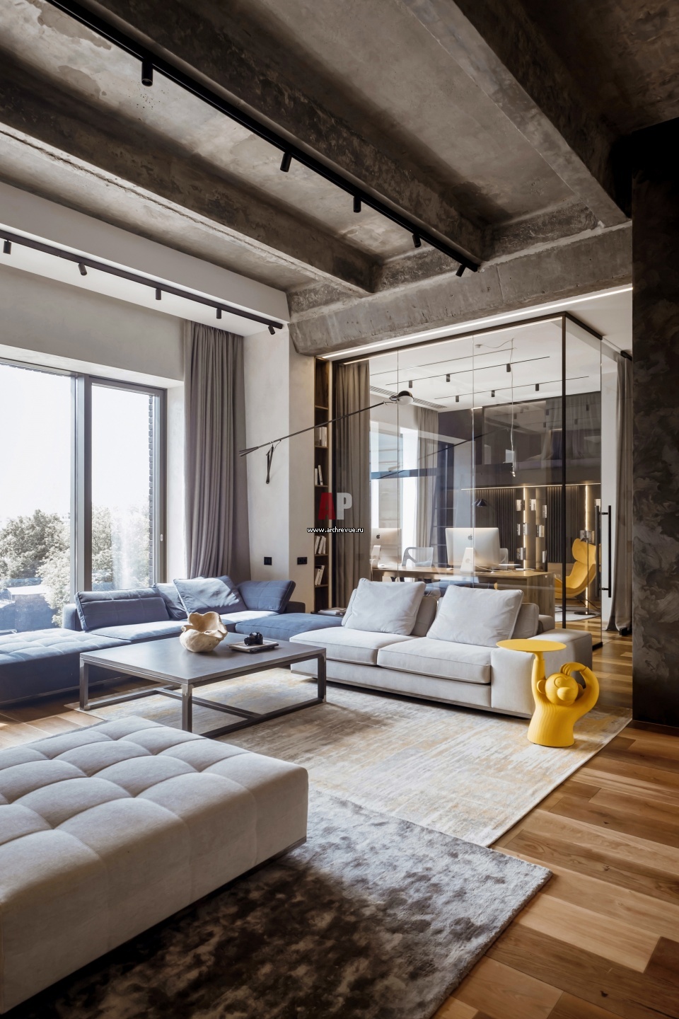 В зоне гостиной потолок с массивными балками был оставлен бетонным, без декоративной отделки. По балкам идут световые шины.