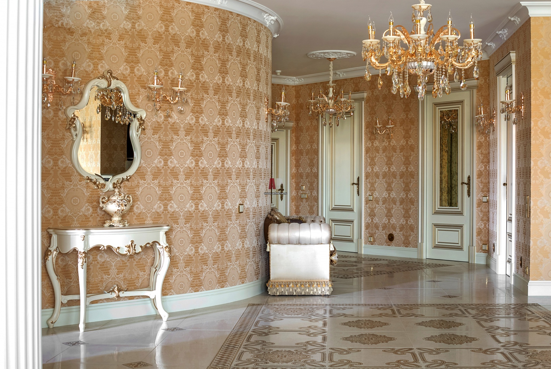 Парадный холл с радиусной стеной оформлен золотыми обоями с изображением тканного классического орнамента.