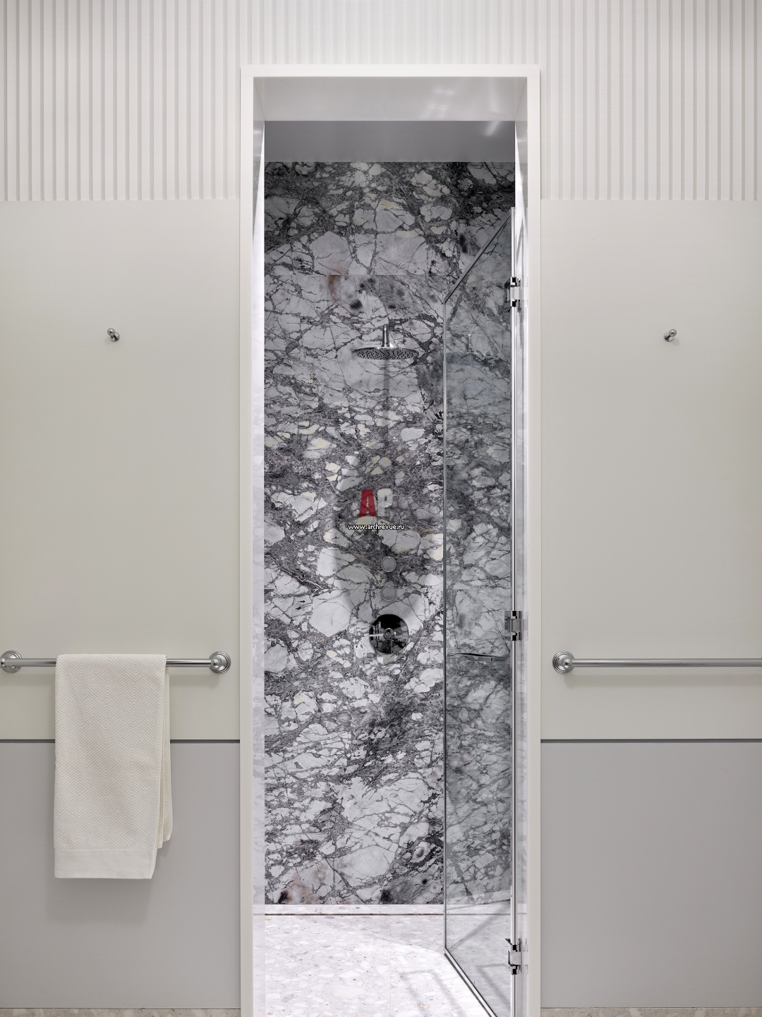 Душевая в хозяйской ванной комнате отделана контрастным темным мрамором.
