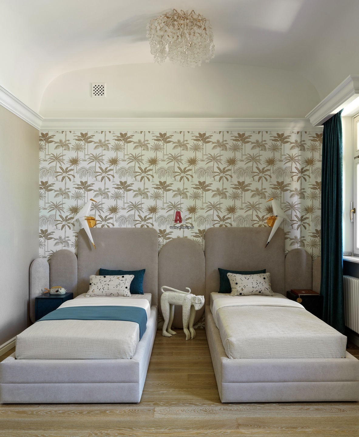 Детская с экзотическим лейтмотивом. Использованы декоративные бра-птицы, журнальный столик в виде обезьяны и акцентные обои с пальмами.