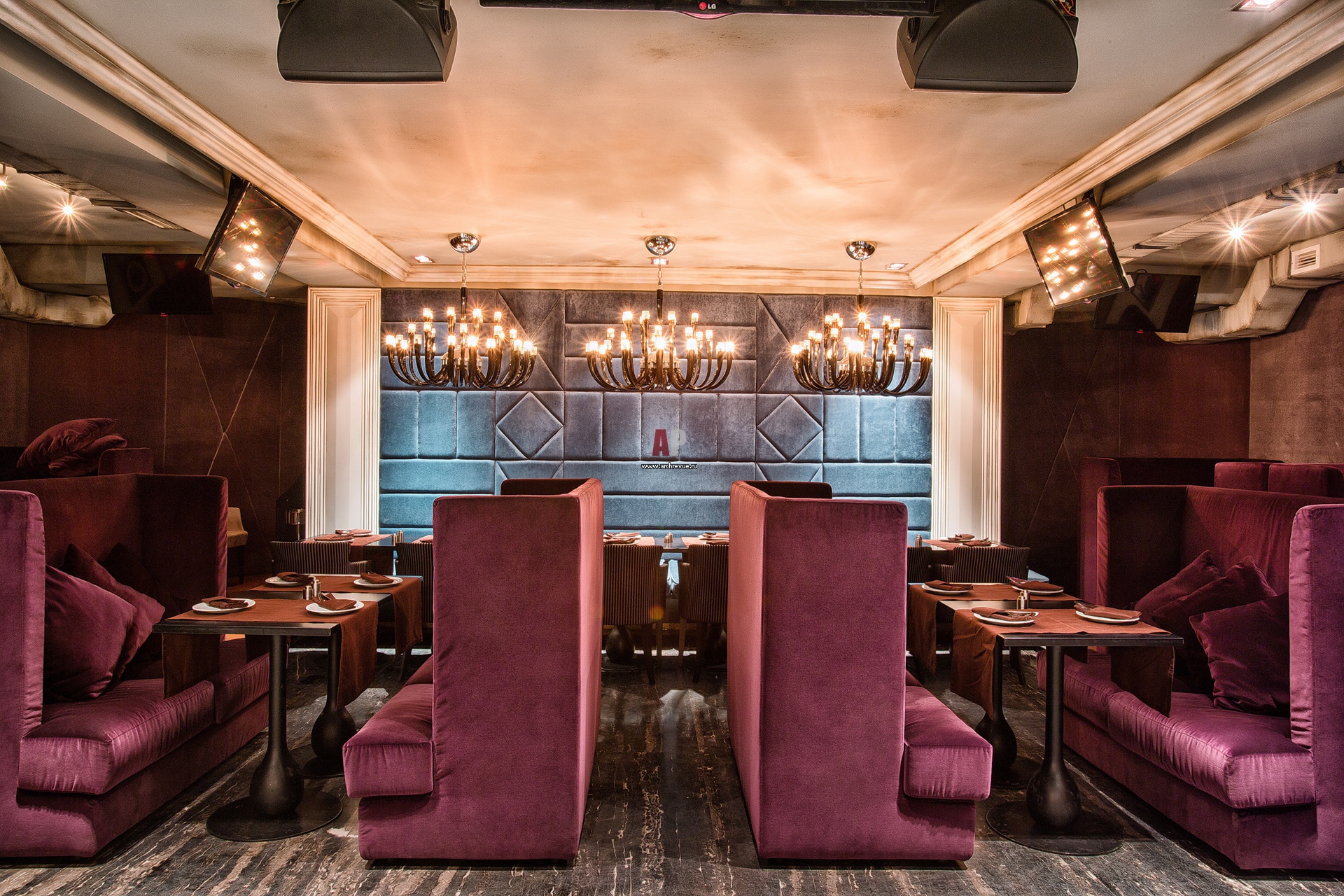 Фото интерьера зоны лаунжа с караоке в стиле фьюжн. Черный мраморный пол с белыми прожилками выглядит живописно. Стены обиты панелями из ткани, использован бархат синего шоколадного цветов. Малиновые диваны с высокими спинками сделаны в Италии.