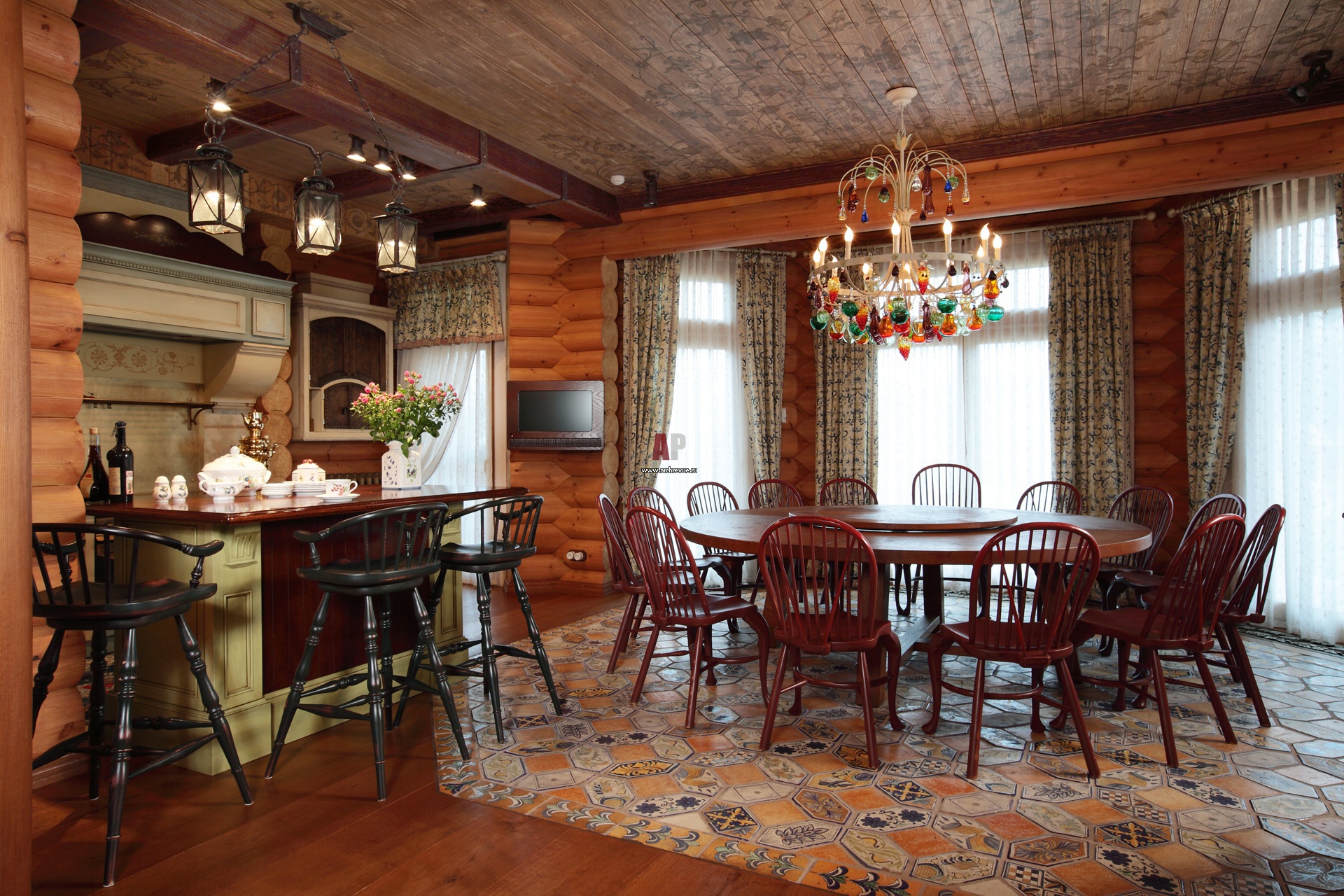 Русский стиль в дизайне интерьера столовой. Зона обеденного стола выделена отделкой пола глиняной плиткой с пестрым орнаментом.