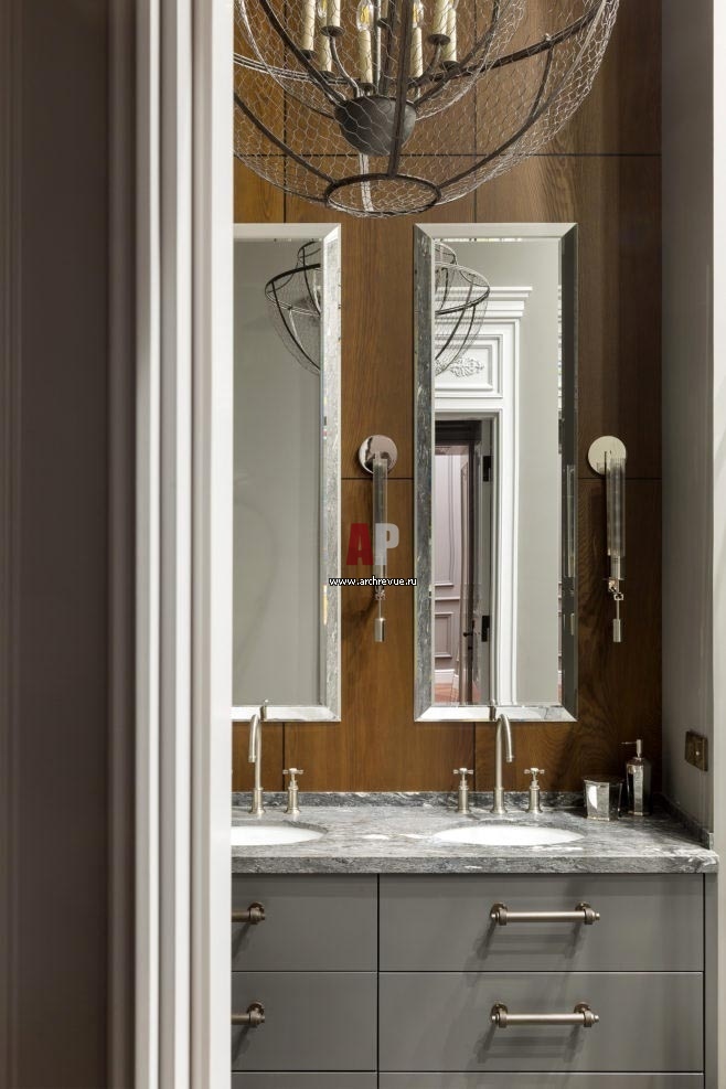 Интерьер мастер-ванной с элементами ар-деко. Тумба под раковины изготовлена на заказ по эскизам дизайнеров компанией «Столичная Столярная Компания». Бра, Restoration Hardware. Центральная люстра, Currey & Company.