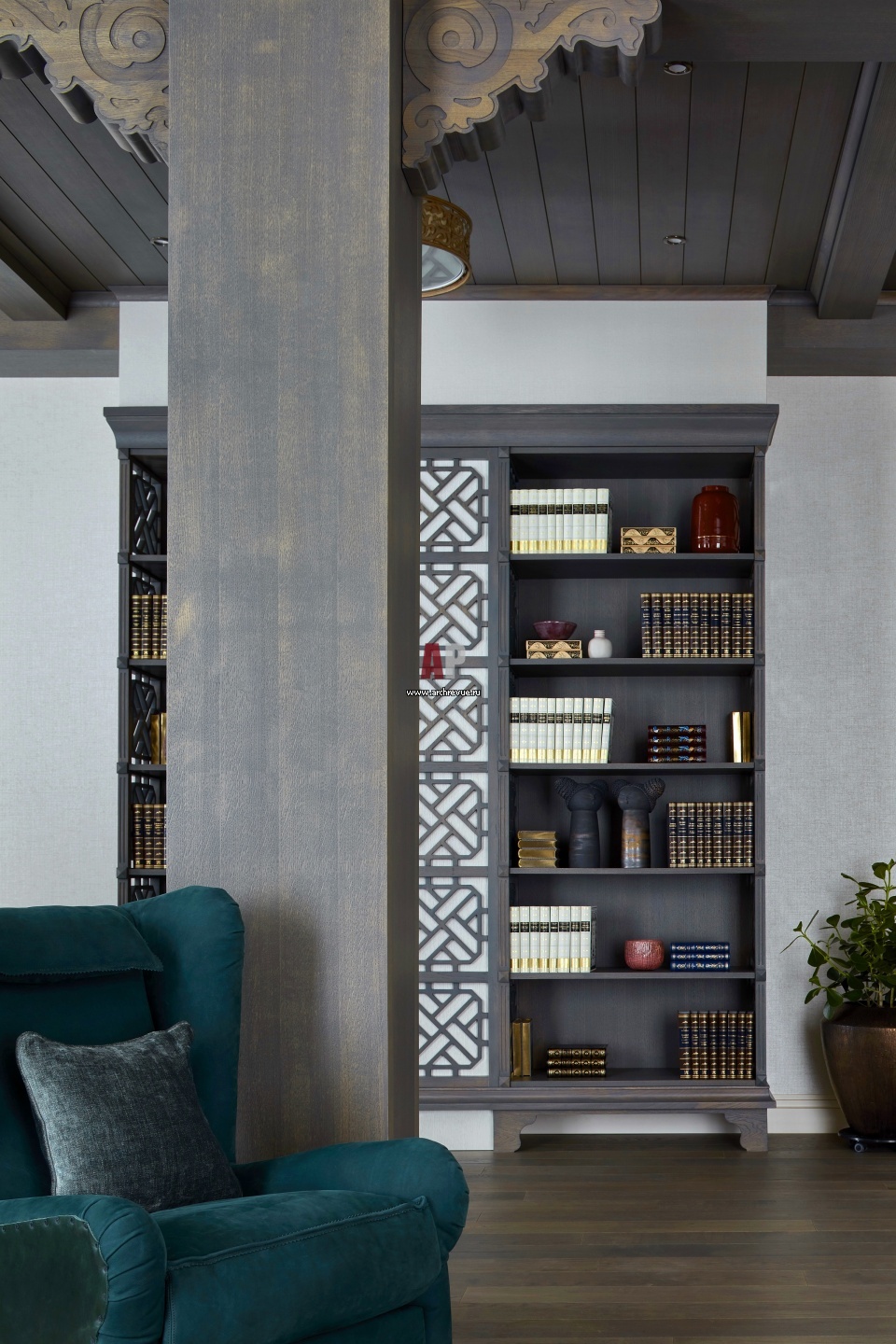 По центру спальни находится несущая колонна. Улучшить общий вид и пропорции помещения удалось с помощью встроенной мебели и декоративных резных кронштейнов.