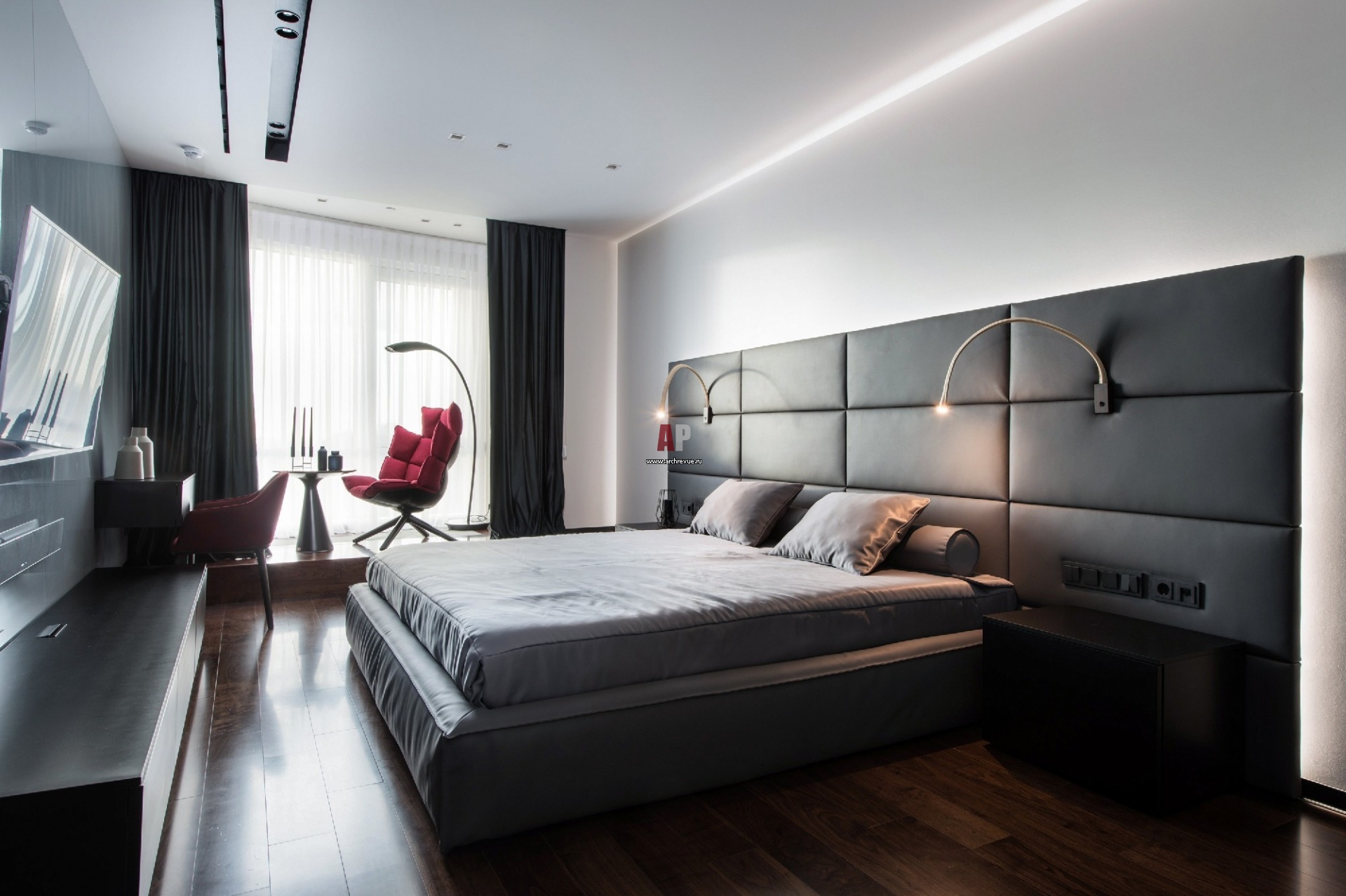 Хозяйская спальня. На полу – массив ореха. Стена за ТВ отделана серым стеклом. Изголовье кровати из экокожи. Кровать, Twils. Прикроватные тумбочки, навесные комоды, Pianca. Стул, Vitra. Кресло, B&B Italia.