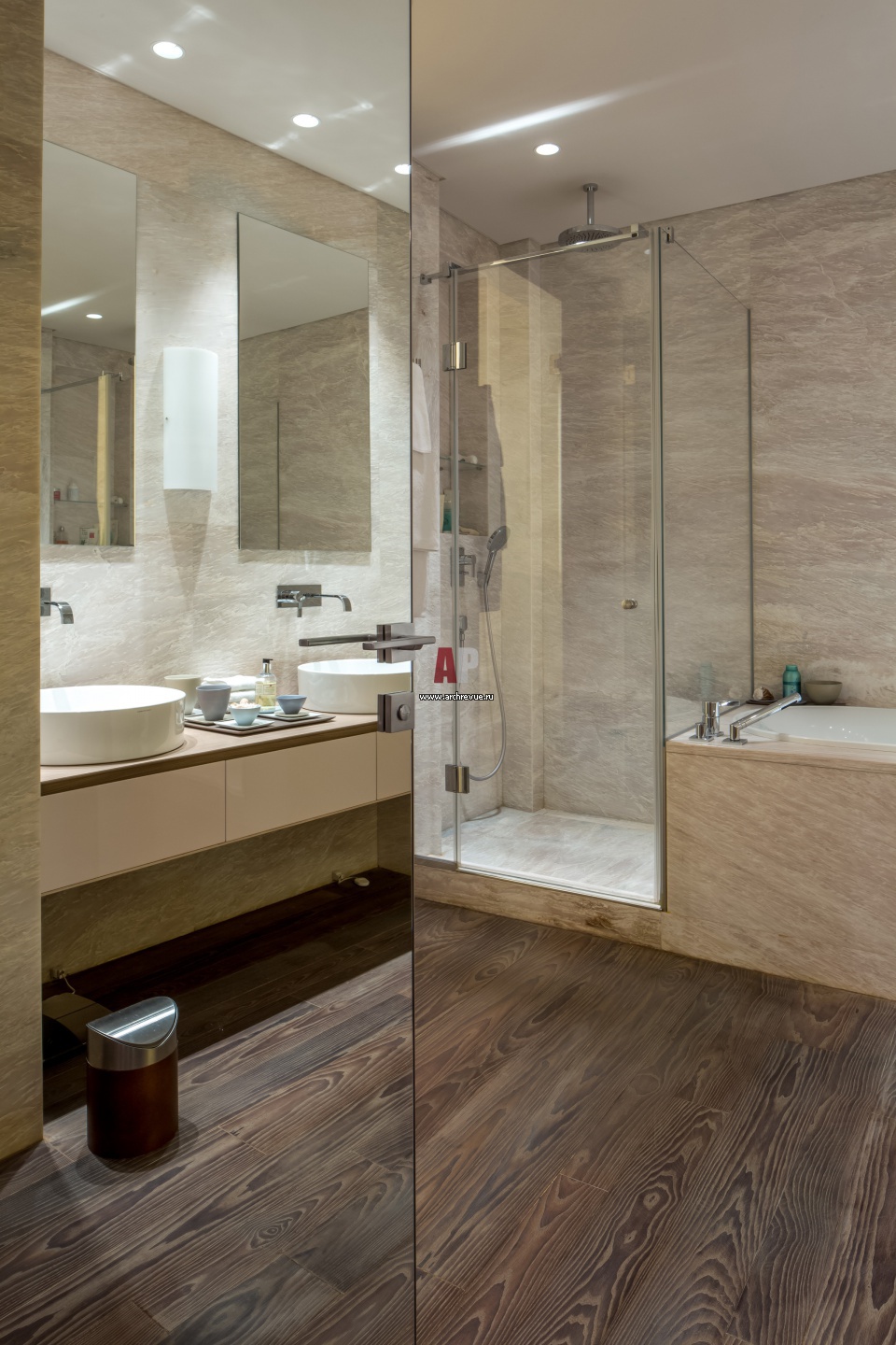 Однозначным требованием в декоре ванной комнаты стала замена привычного напольного покрытия в виде плитки или камня на дерево. Пол выстлан термообработанной доской из ясеня.
