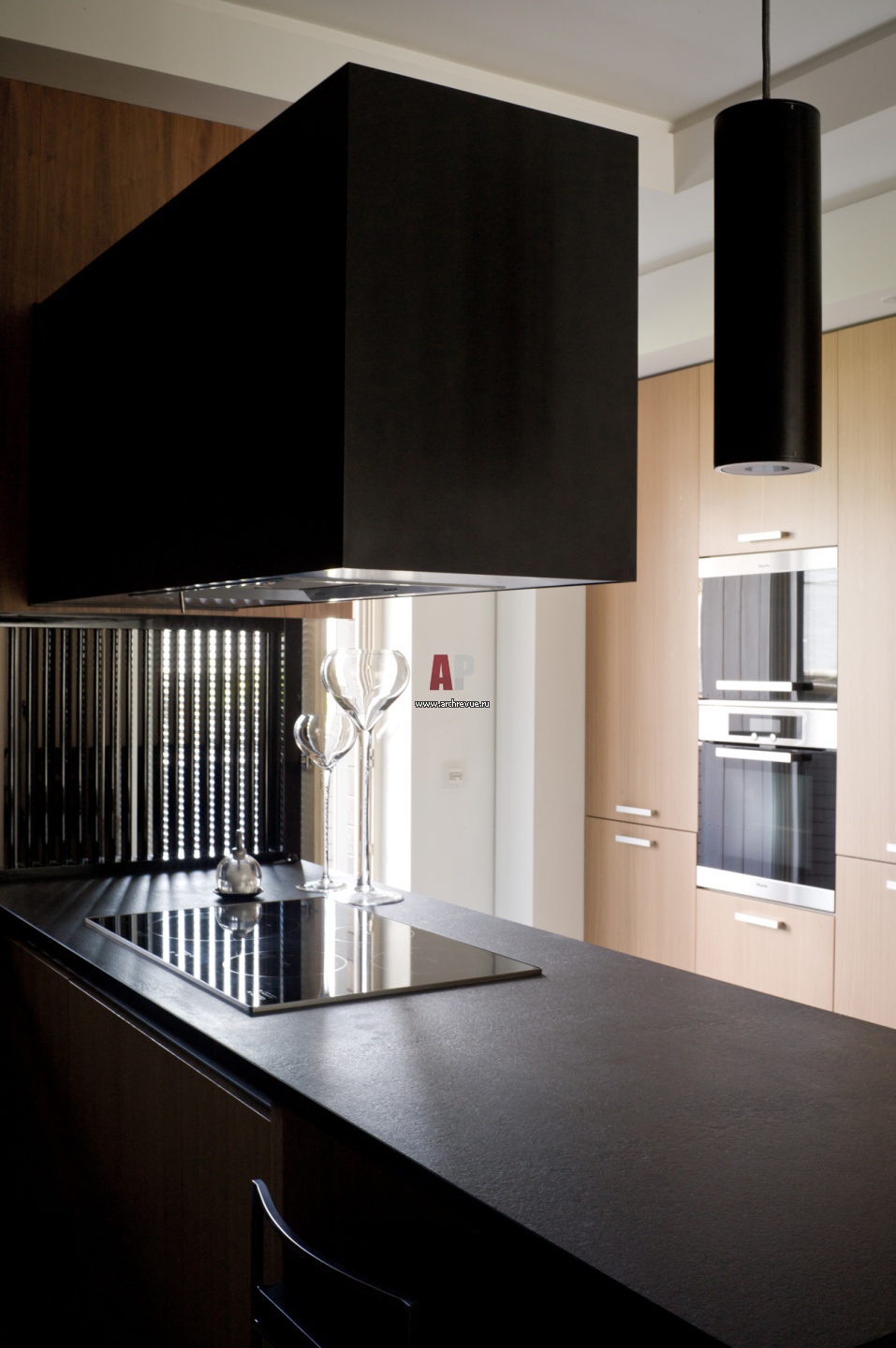 Композиционный центр кухни – рабочая зона. Столешница из гранита. На фасадах – выбеленный дуб.