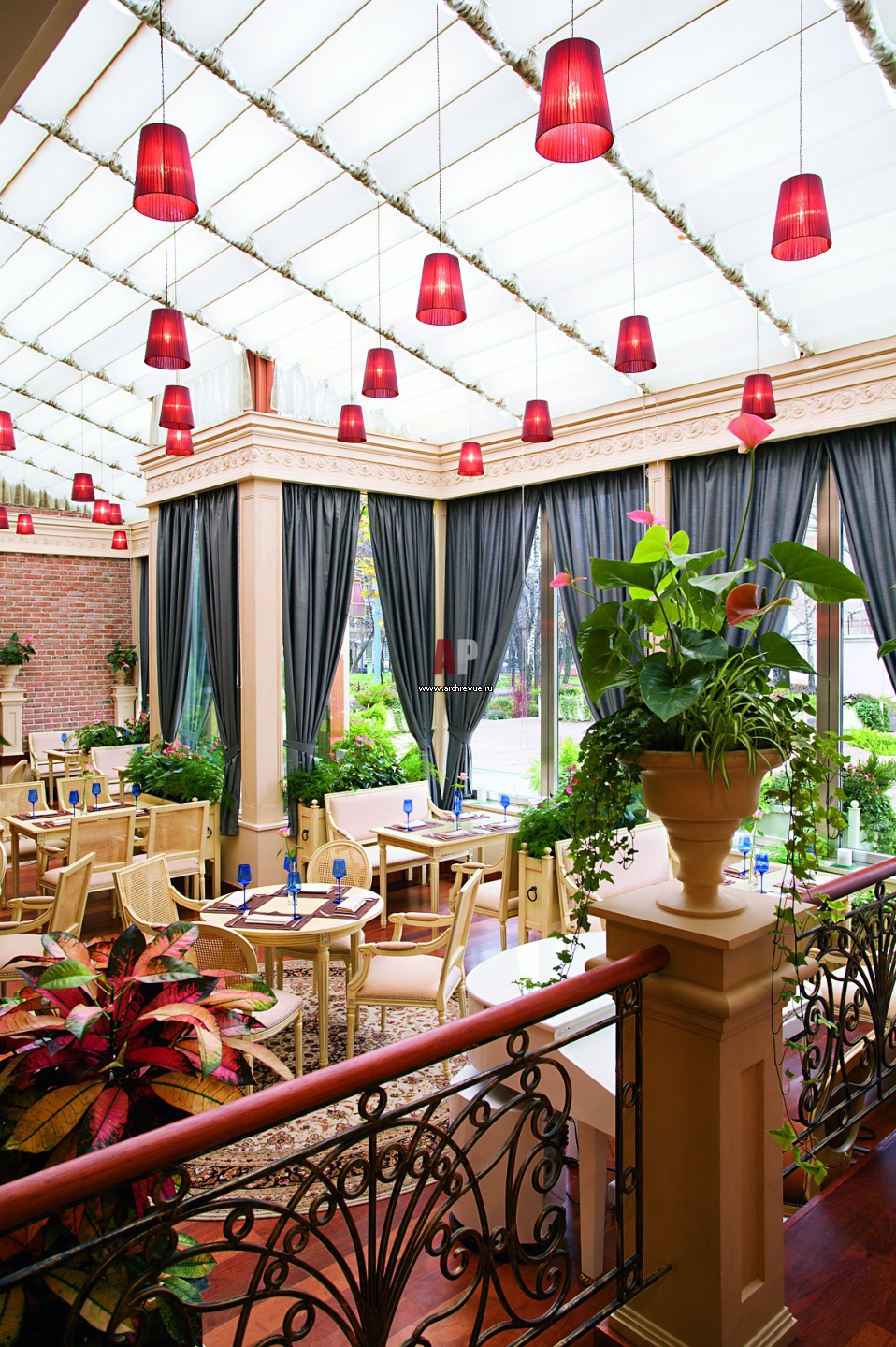 Вид от входа на основной зал ресторана. Он словно «утоплен» в пол и похож на оранжерею.
