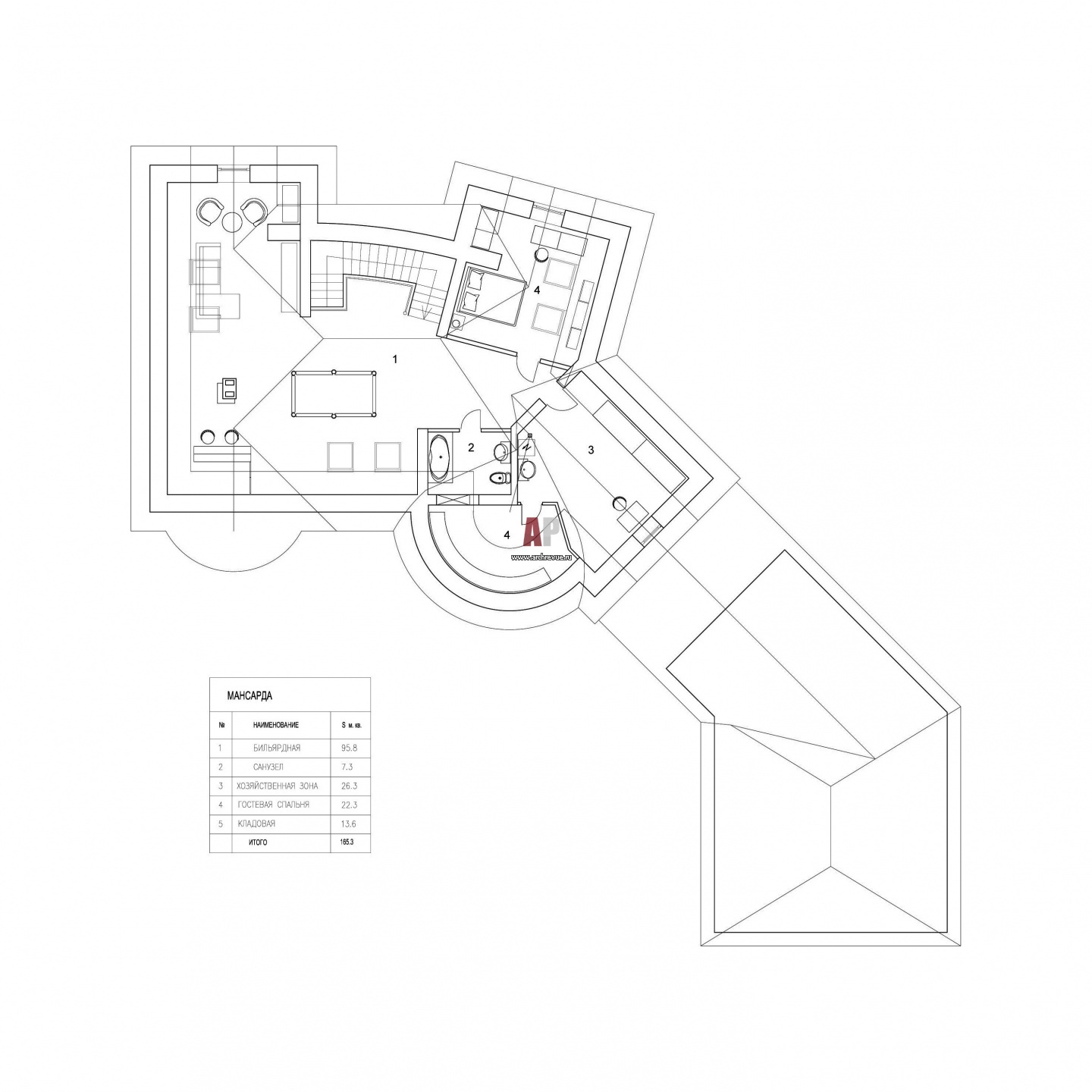 Планировка мансарды 3-х этажного дома 585 кв. м. с мансардой в отделке деревом.
