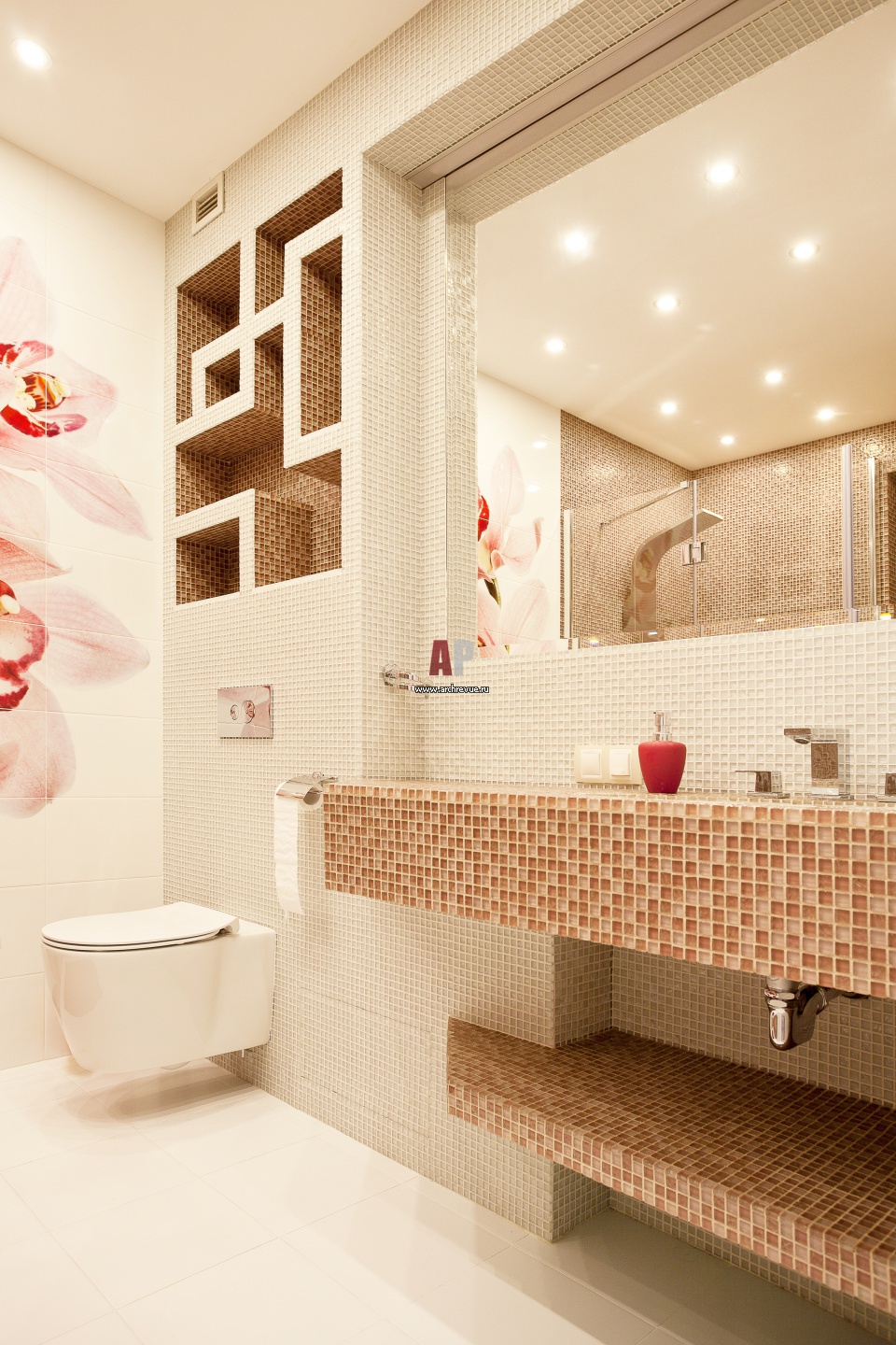 Интерьер хозяйского санузла с красно-лиловой мозаикой и керамическим панно с изображением орхидей.