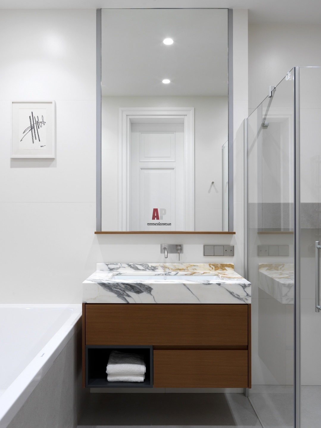 Хозяйский санузел. Тумба под раковину сделана на заказ по чертежам архитектора. Сантехника, Duravit. Смесители, Gessi.