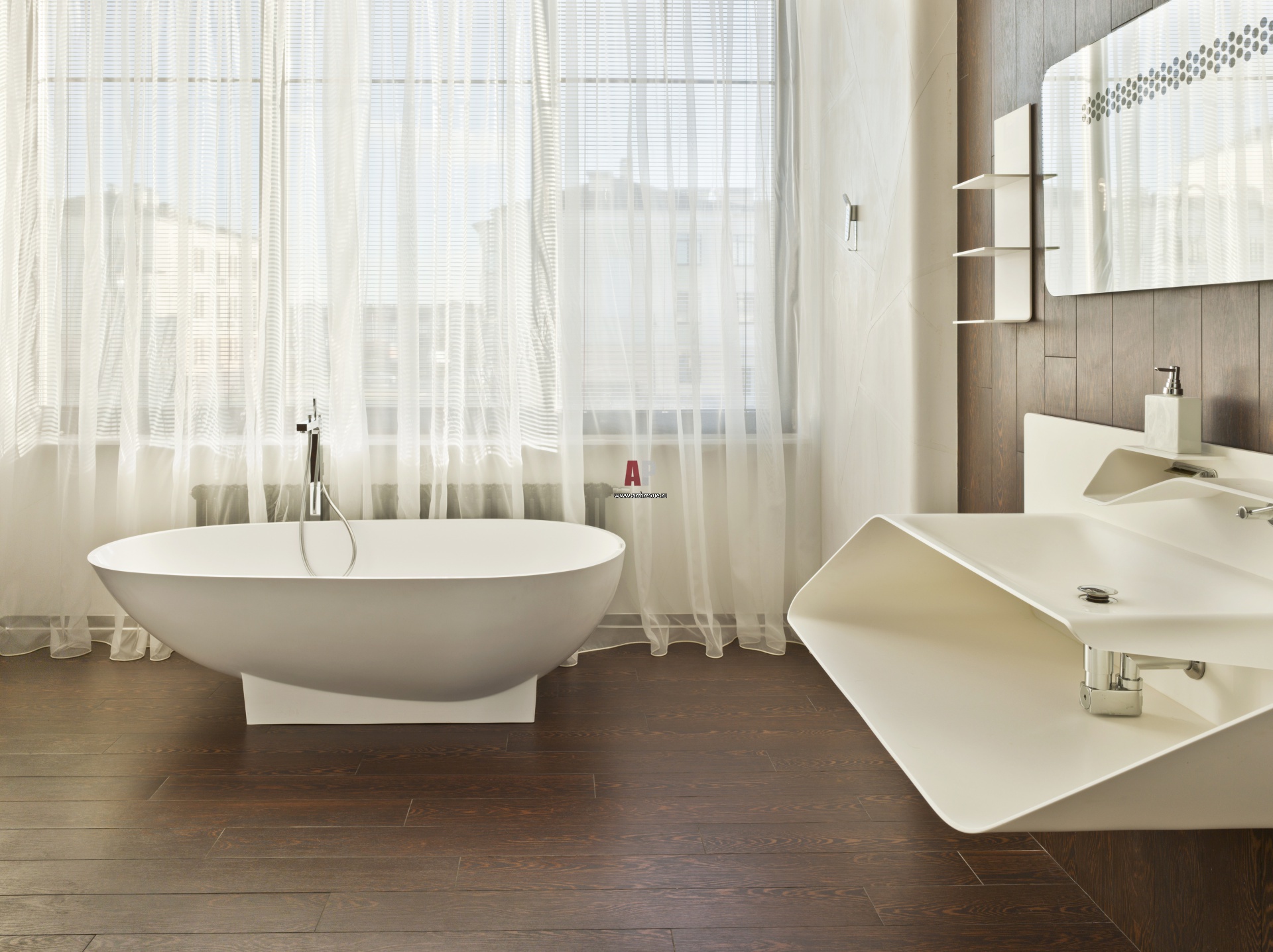 На стенах и полу хозяйской ванной комнаты – керамогранит, имитирующий дерево, поставщик BARS RED. Раковина от Bandini изогнутой формы отлита из пластика. Вся остальная сантехника подобрана под нее.
