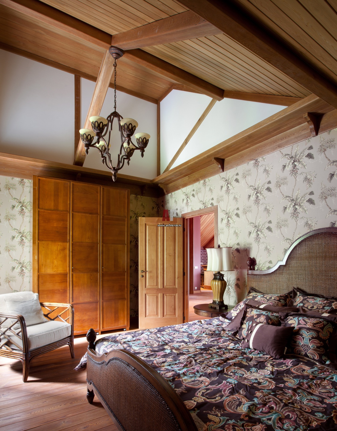 Интерьер спальни в мансарде выполнен в колониальном стиле. Бумажные обои с изображением пальм. Массивный дубовый шкаф, Morelato. Американская кровать со спинкой из плетеной соломы, Lexington.