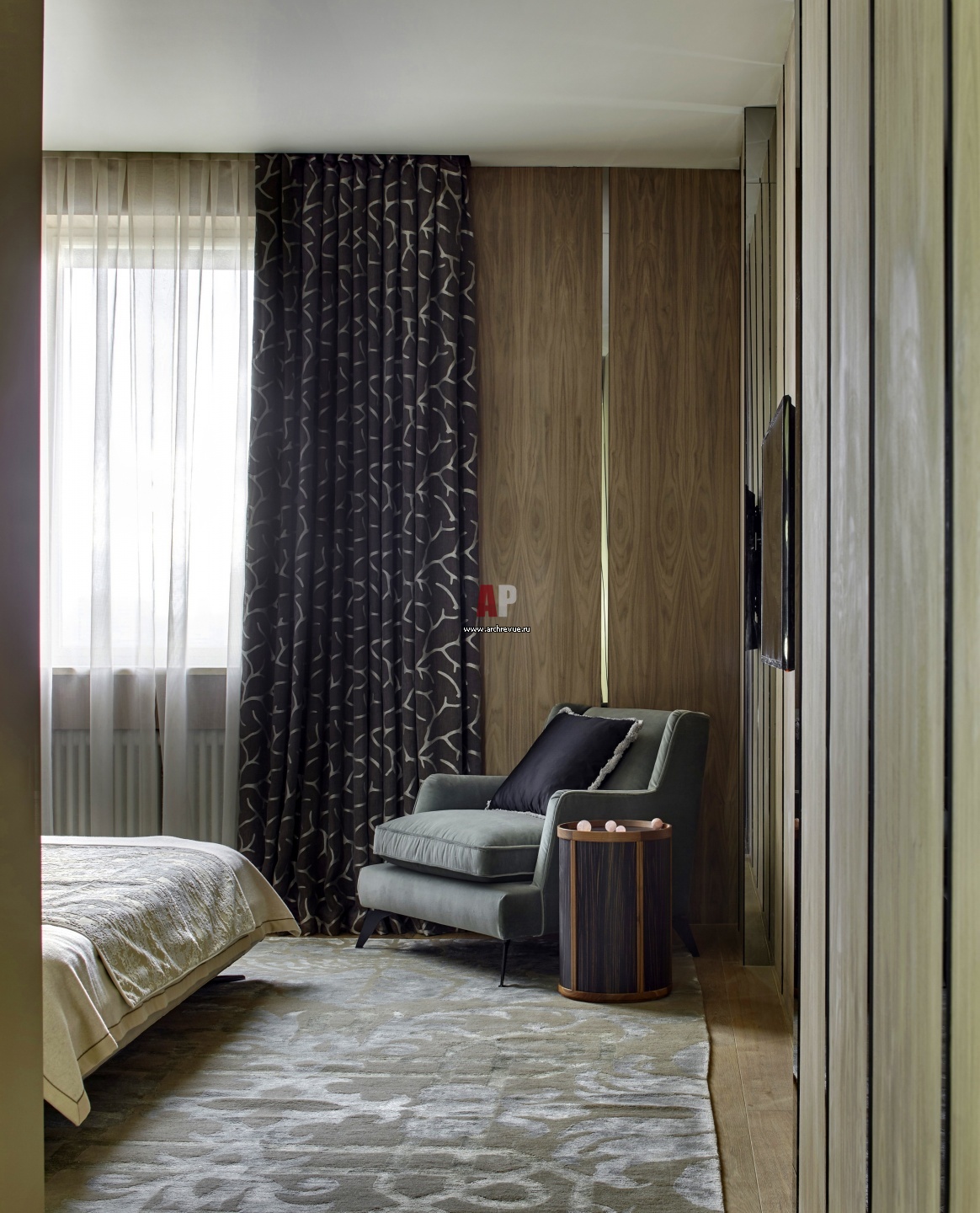 Оконный проем в спальне обрамлен обоями со шпоном из американского ореха. Стыки полотен замаскированы тонкими вертикальными металлическими вставками. Кресло, Mobileffe.