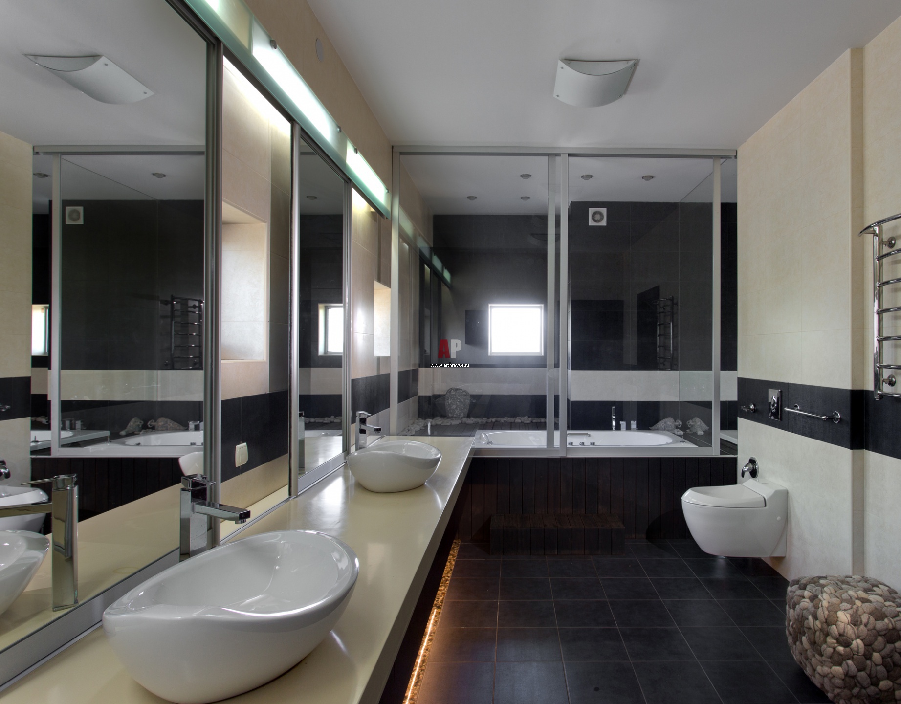 Интерьер ванной комнаты строится на контрасте черного и белого. Сантехника обтекаемых, органических форм.