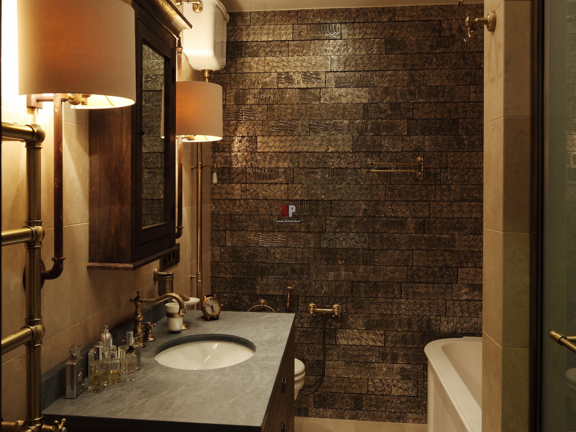 В дизайне интерьера гостевого санузла использована каменная плитка Petra Antiqua двух видов: из светлого мрамора и из темно-серого камня. Серая плитка в форме кирпичиков имеет рельеф и природную фактуру. Над умывальником находится шкафчик для лекарств, который есть в каждом американском доме.