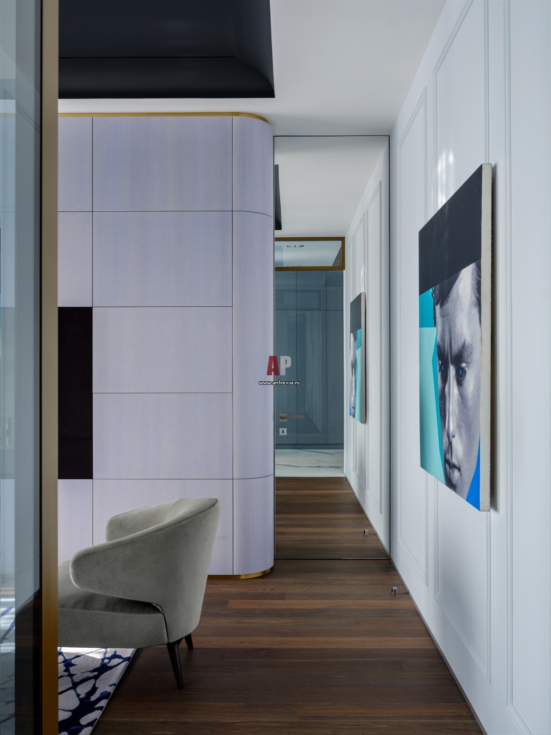 Один угол шкафа скруглен. К нему примыкает зеркальная дверь в спальню. Все двери в квартире имеют скрытые короба и высоту до потолка, подчеркивая трехметровые потолки.