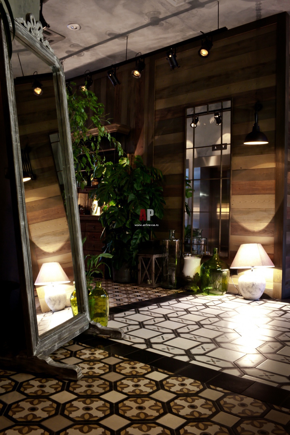 Входная зона грузинского ресторана акцентирована плиткой с геометрическим рисунком в стиле кантри.