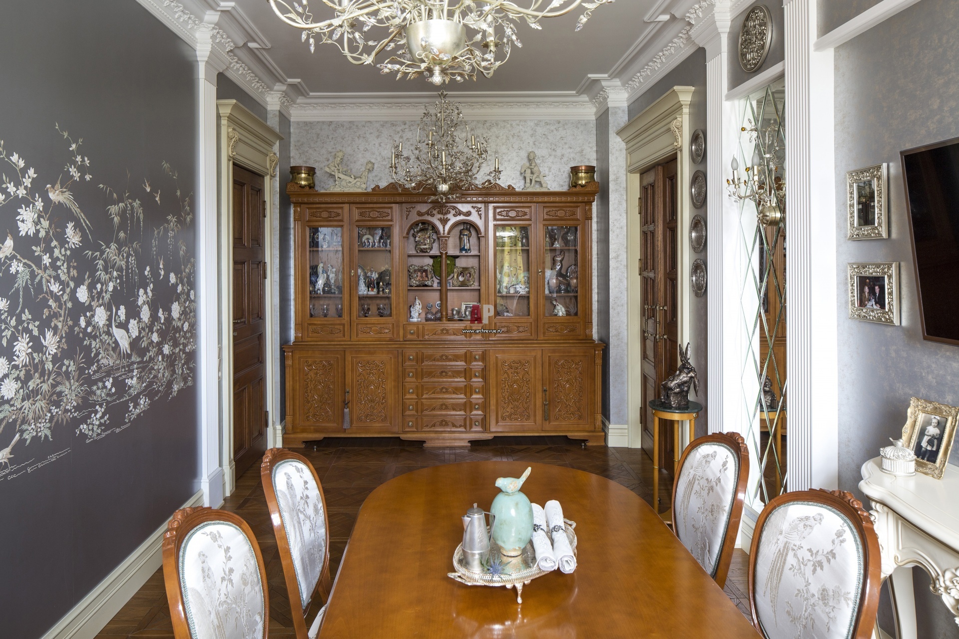 Украшение столовой – серебристые обои Ronald Redding (коллекция Silver Leaf) с изображением райского сада. Обеденный стол, стулья, резной дубовый буфет – антикварные. Паркет, дуб, поставщик «Олимп Паркета».