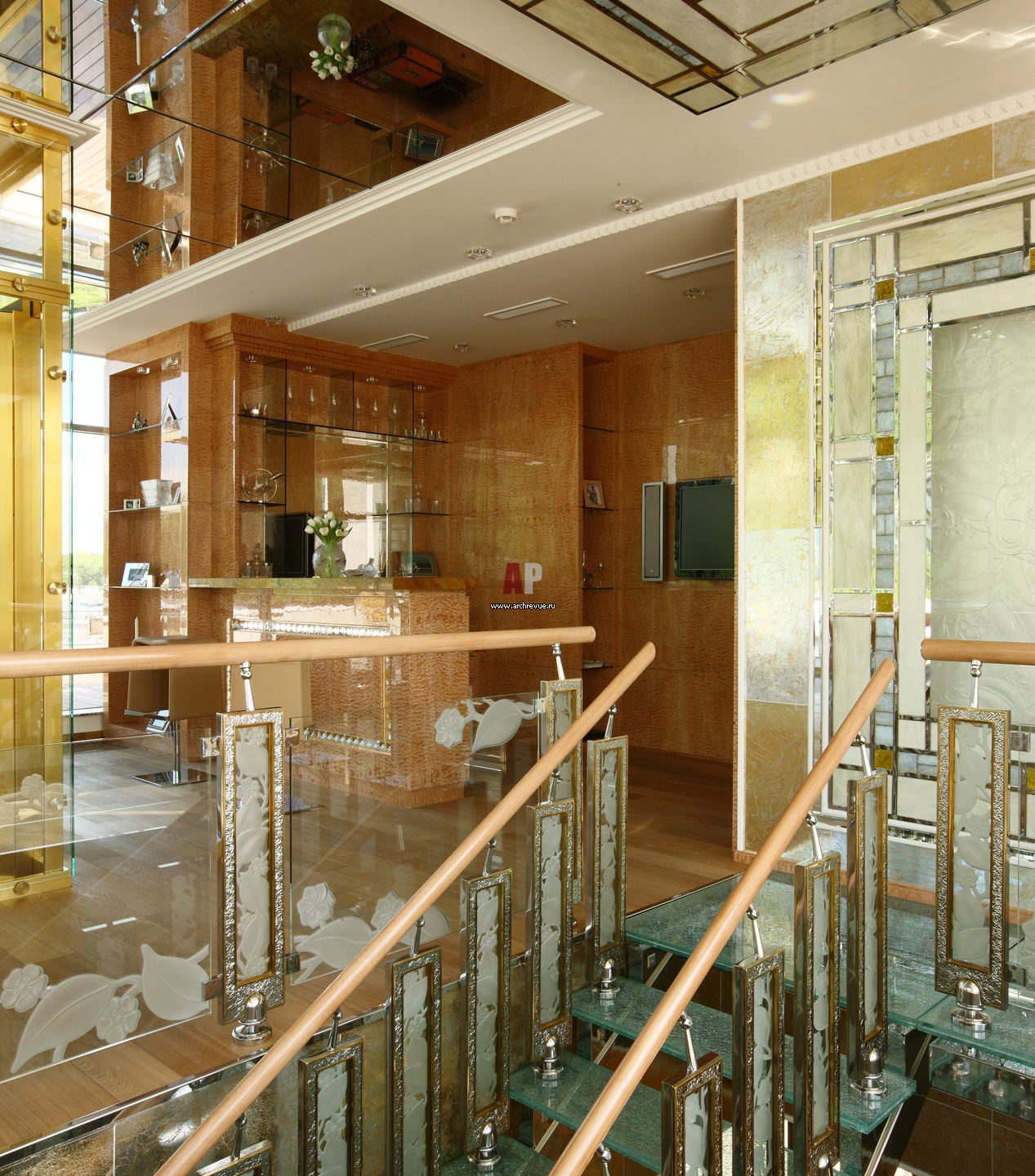 Зона домашнего бара находится на крыше, в надстроенном стеклянном объеме, рядом с бильярдной. Попасть в нее можно поднявшись по парадной лестнице или на лифте.