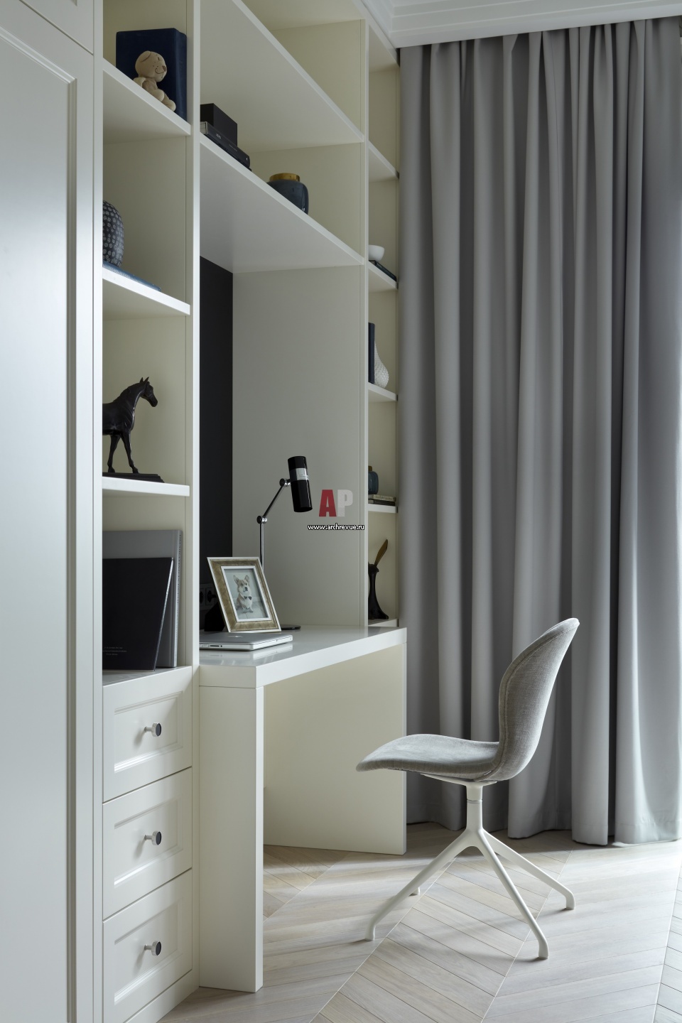 Стеллаж в детской со встроенным рабочим местом изготовлен на заказ. Настольная лампа на рабочем столе, Cosmorelax.