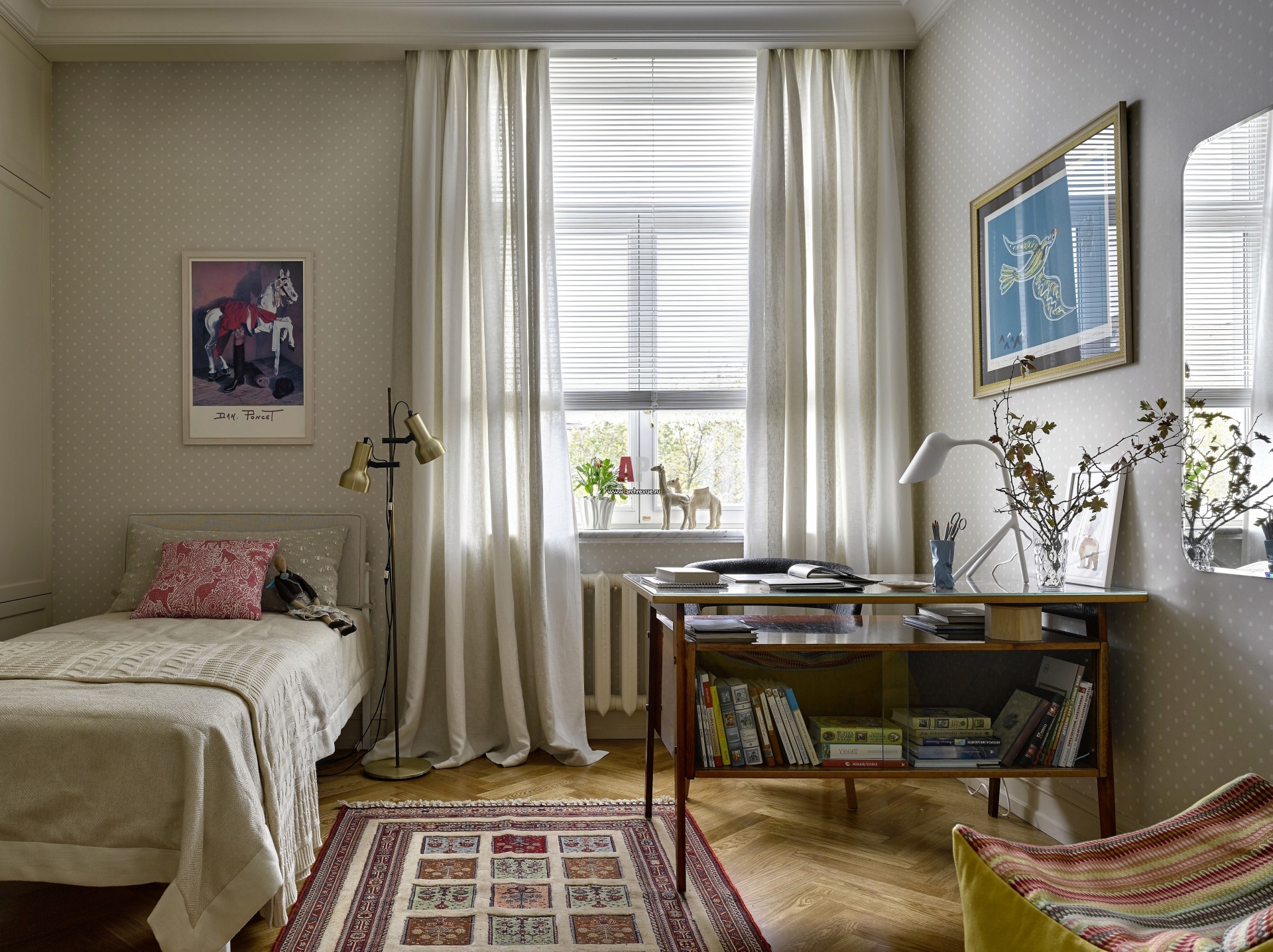 Детская комната. Обои BorasTapeter в горошек нейтрального серо-бежевого цвета перекликаются с обоями в хозяйской спальне. Кровать, Zanotta.