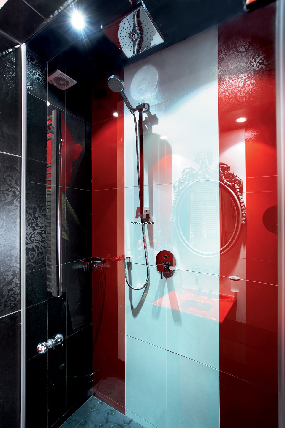 Душевая кабина в интерьере детского санузла. Перегородки выполнены из прозрачного стекла. Кабина оснащена оборудованием «тропический дождь».
