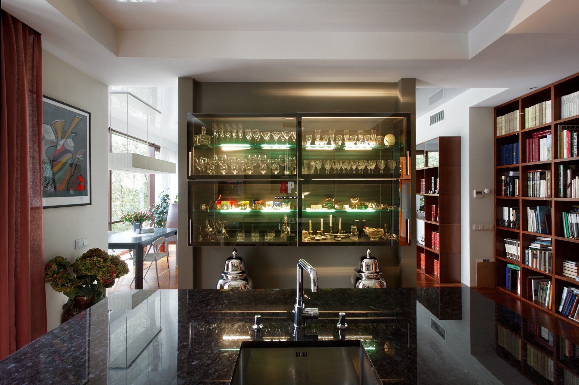 Островная часть кухни. Столешница из полированного камня. На стене напротив – оригинальный современный буфет с хрусталем.
