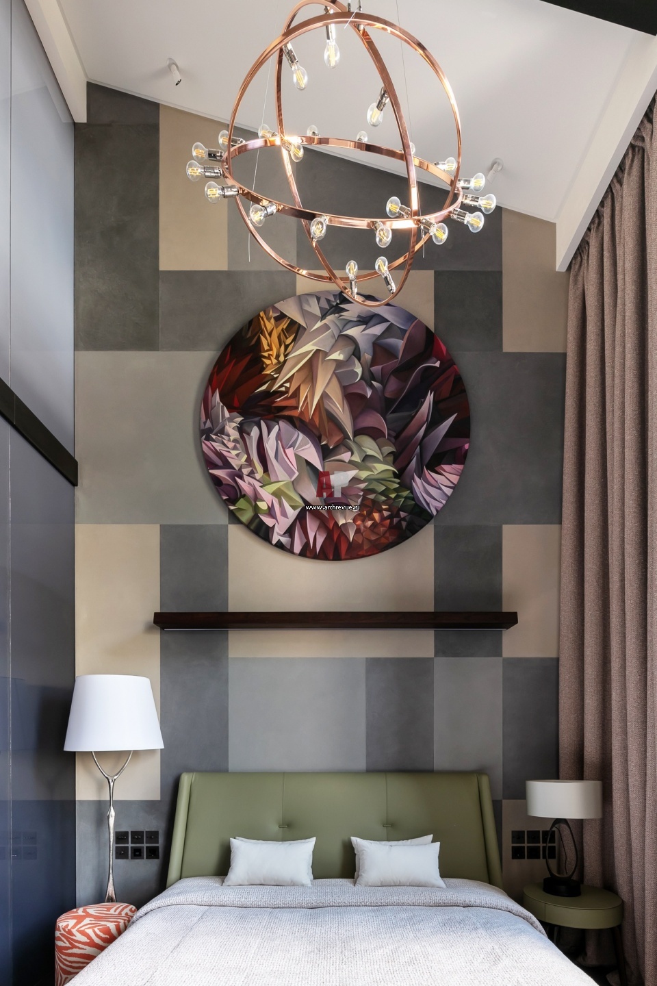 Хозяйская спальня на первом этаже. Кровать с кожаным изголовьем Poltrona Frau, модель Suzie Wong Extra. Стена оформлена геометрическим принтом и круглым панно «Рондо», художник Ольга Тобрелутс. Люстра из меди Licht im Raum, модель Dione, изготовлена вручную по мотивам светильника, созданного компанией в 1960-х годах.