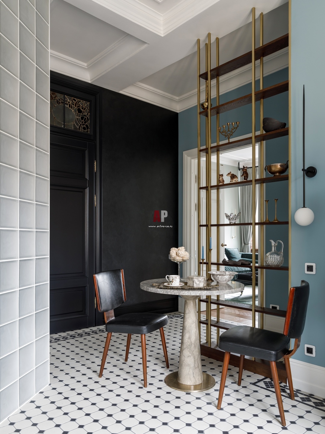 Столовая группа на кухне. Обеденный стол изготовлен из мрамора на заказ. Витраж над дверью в санузел – исторический.