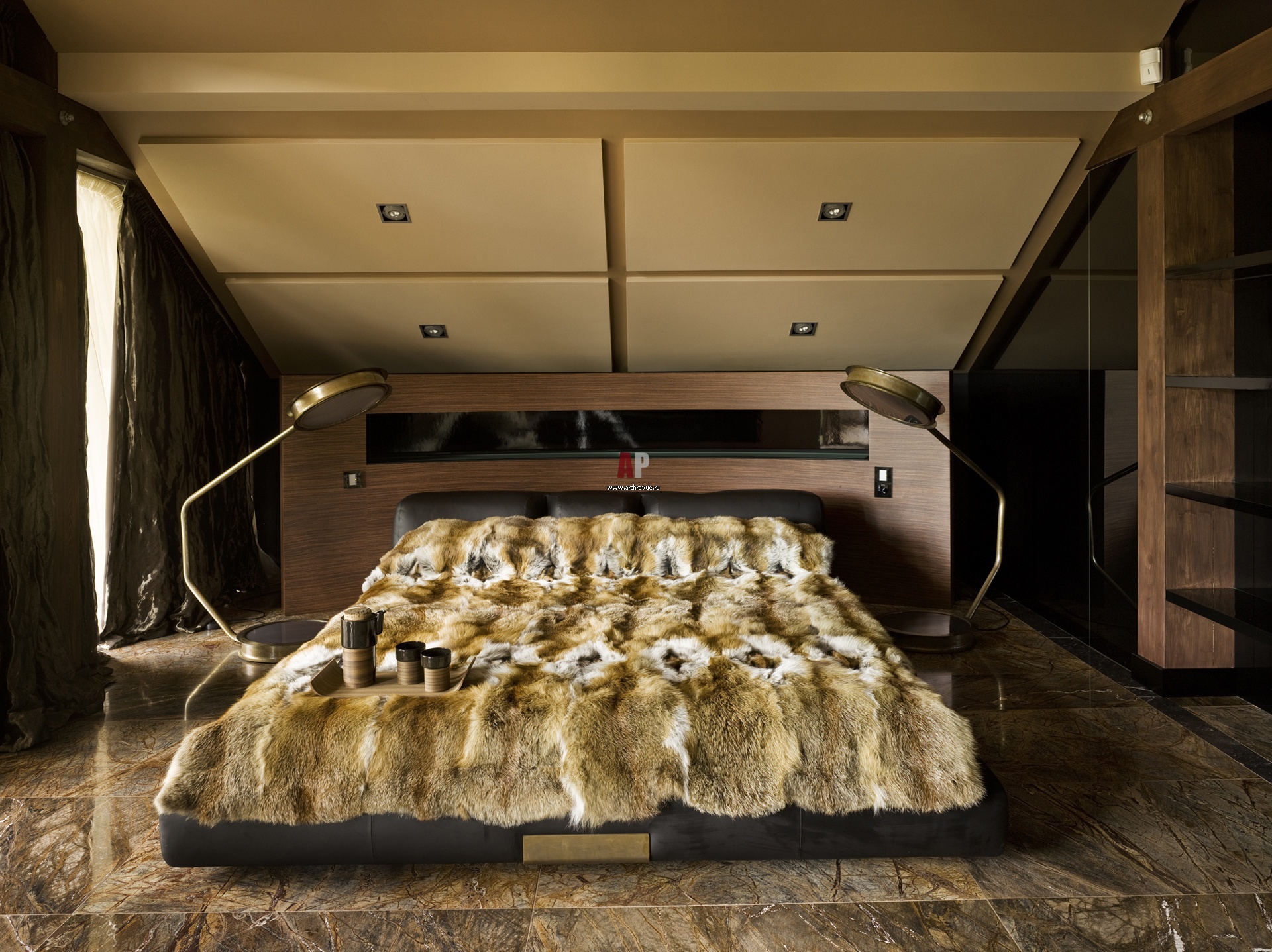 Фото интерьера спальни в духе роскошного ар-деко. На полу – мрамор сорта Forest Brown, который сочетается с покрывалом из лисьих шкур. Кровать, Ceccotti.